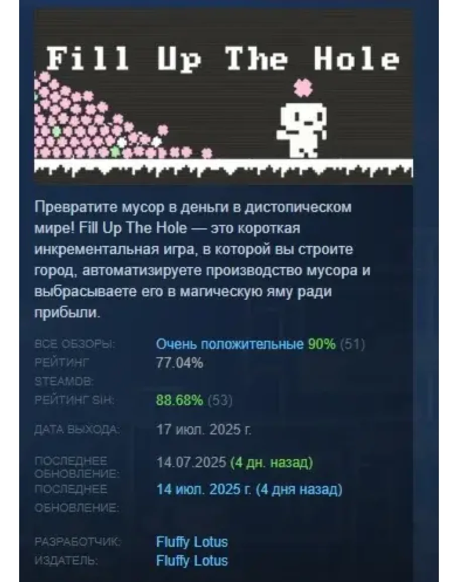 Превратите мусор в деньги в дистопическом мире! Fill Up The Hole — это короткая инкрементальная игра, в которой вы строите город, автоматизируете производство мусора и выбрасываете его в магическую яму ради прибыли.