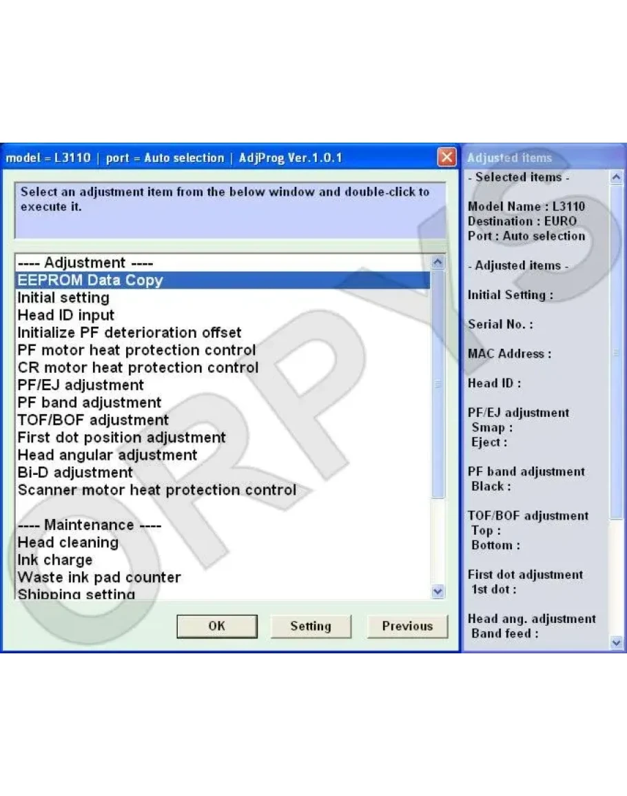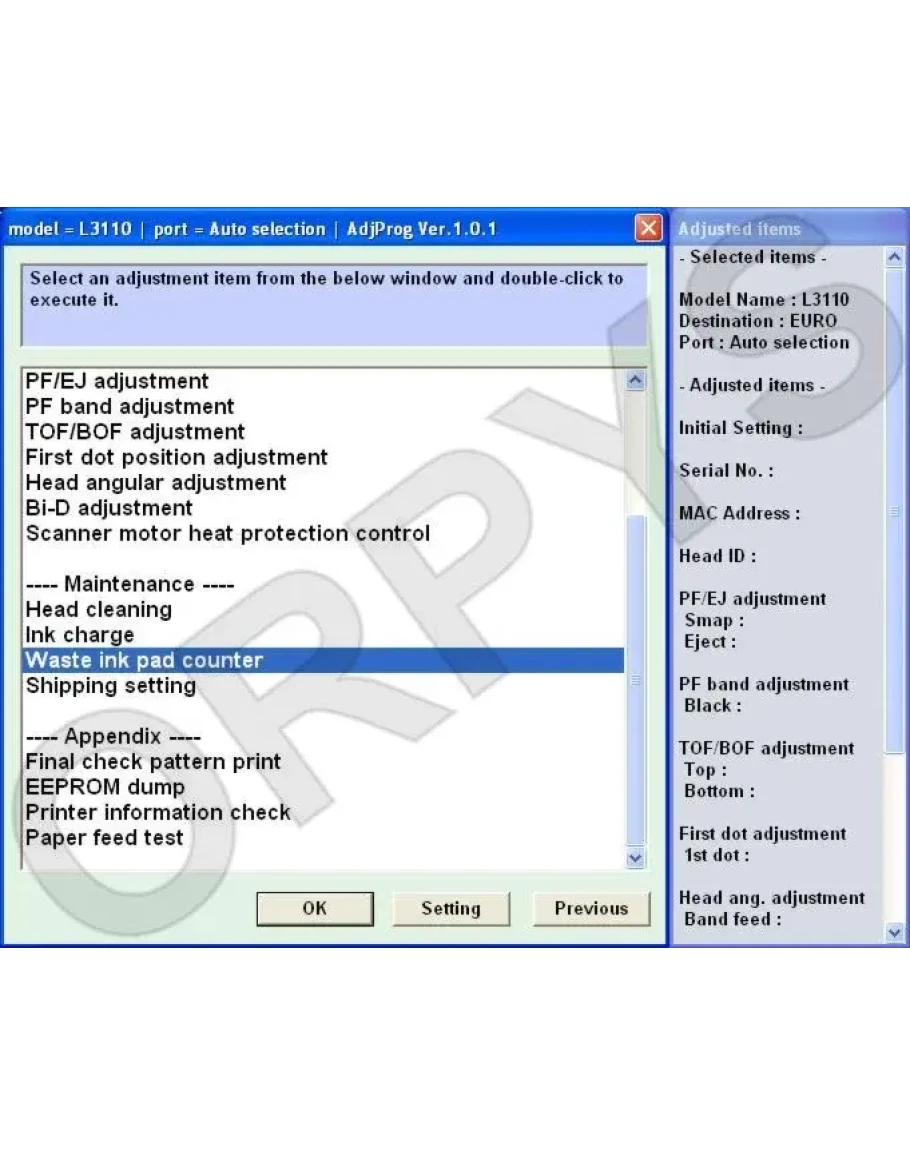 Epson L1110, L3100, L3101, L3110, L3111, L3150, L3151, L5190 (EURO) Ver.1.0.1 Service Adjustment Program — это оригинальная сервисная программа для указанных моделей принтеров, программа позволяет сбросить счетчик памперса (абсорбер), прописывать ID печатающей головки, делать инициализацию принтера и другие функции.