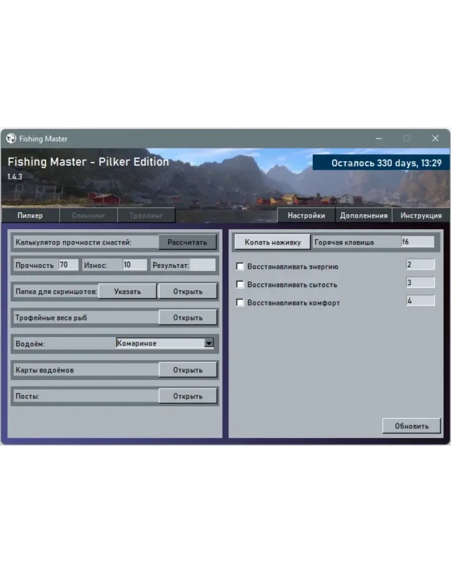 Введена адаптивная функция добычи наживки лопатой/черпаком. Износ снастей можно посчитать на встроенном калькуляторе.