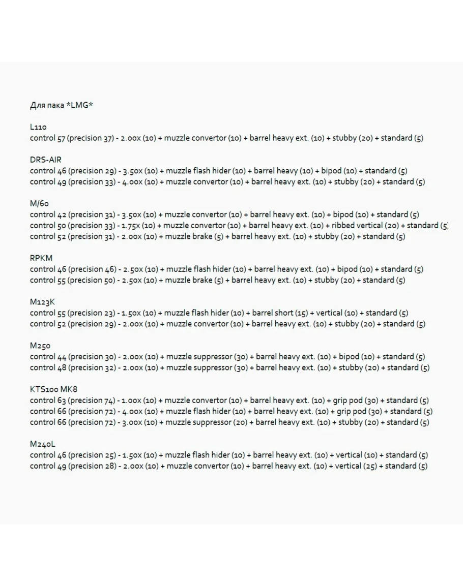 control 66 (precision 72) - 3x suppressor (20) + barrel heavy ext. (10) + stubby (20) + standard (5)