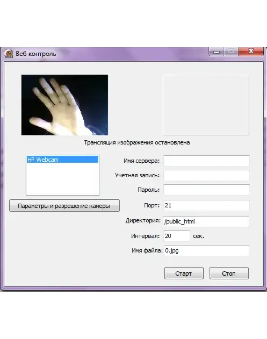 Программа Веб контроль позволяет делать снимки с установленной веб камеры,сжимать и записывать их в файл, а затем отправлять полученное изображение по FTP протоколу на хостинг для сайта.