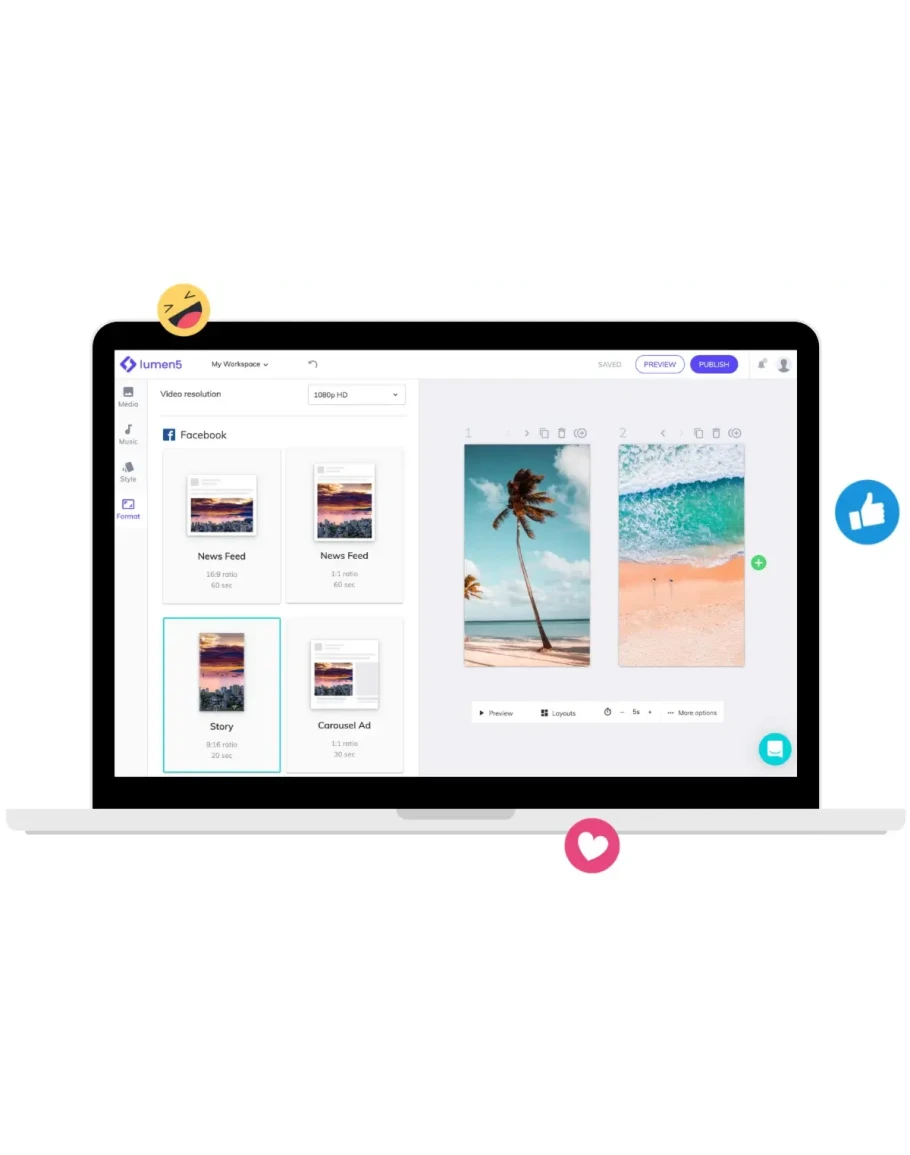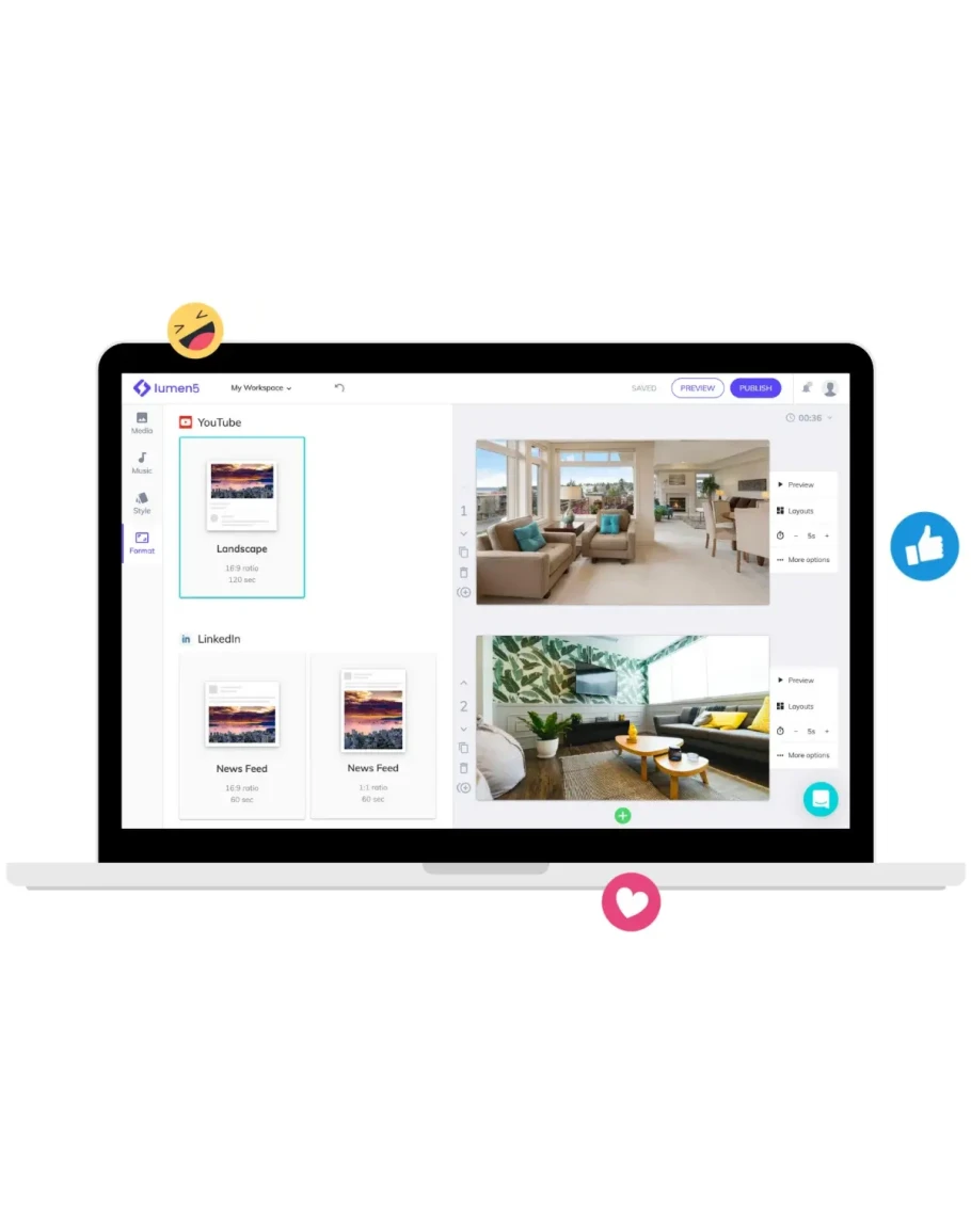 Lumen5 — платформа для генерации видео с помощью искусственного интеллекта. В ней пользователи создают видео для публикации в соцсетях, рекламных каналах и для презентации продуктов. Есть два варианта создания видео: генерация из текстового поста и создание видео с нуля.