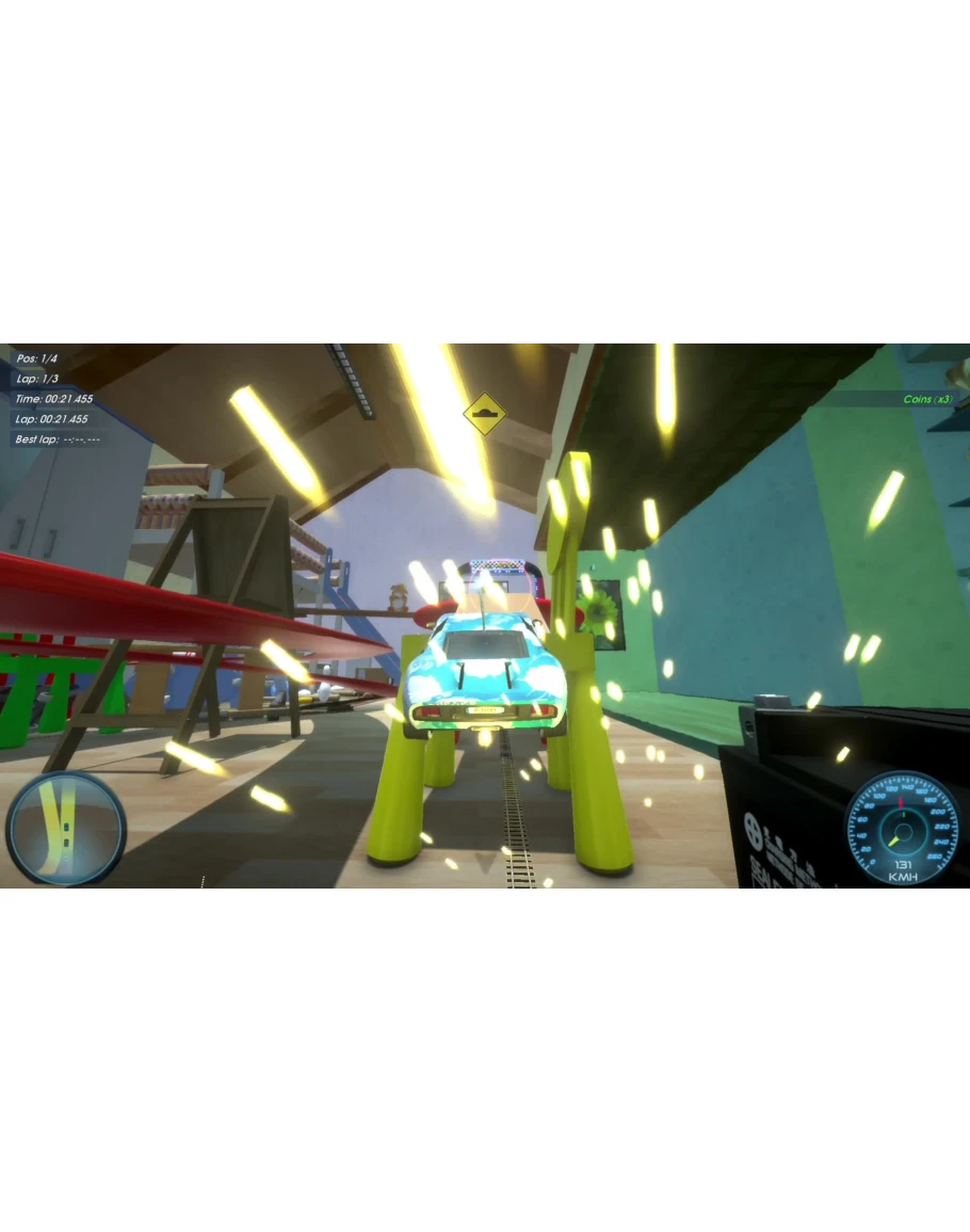 📌 Игроки соревнуются, запуская маленькие радиоуправляемые машинки на безумных трехмерных трассах в частном доме и прилегающем саду.