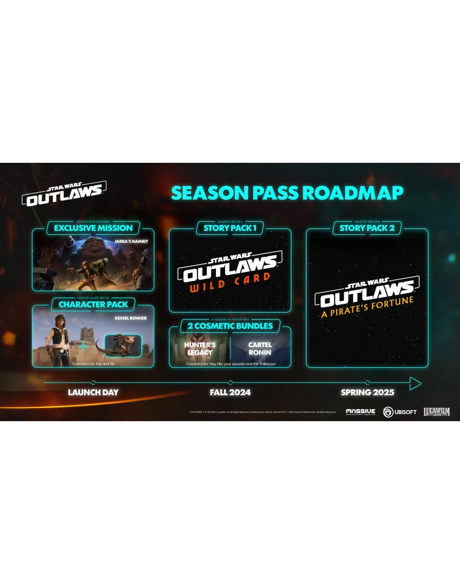 С сезонным пропуском Star Wars Outlaws вы получите доступ к дополнениям Wild Card и A Pirate's Fortune, эксклюзивному заданию первого дня "Гамбит Джаббы" и набору предметов персонализации "Кессельский перевозчик".