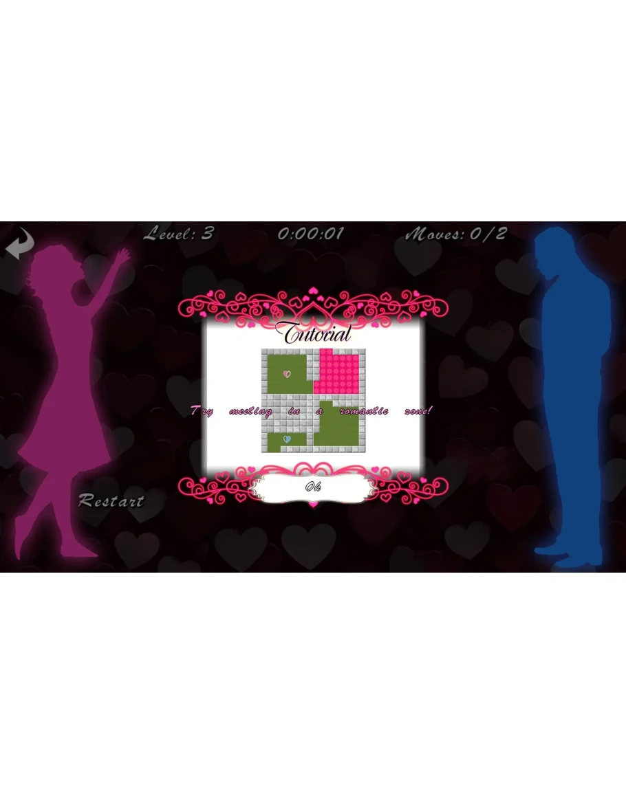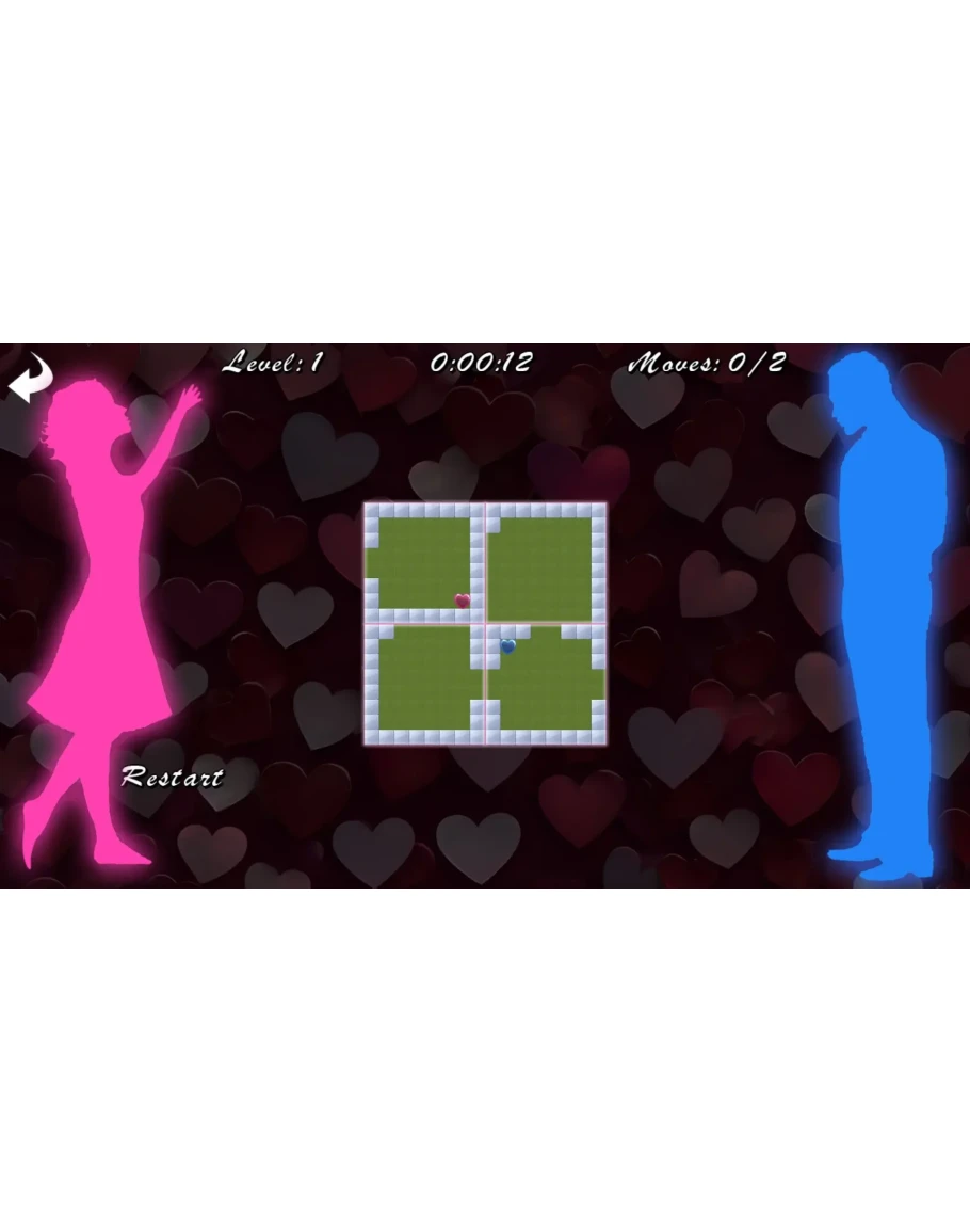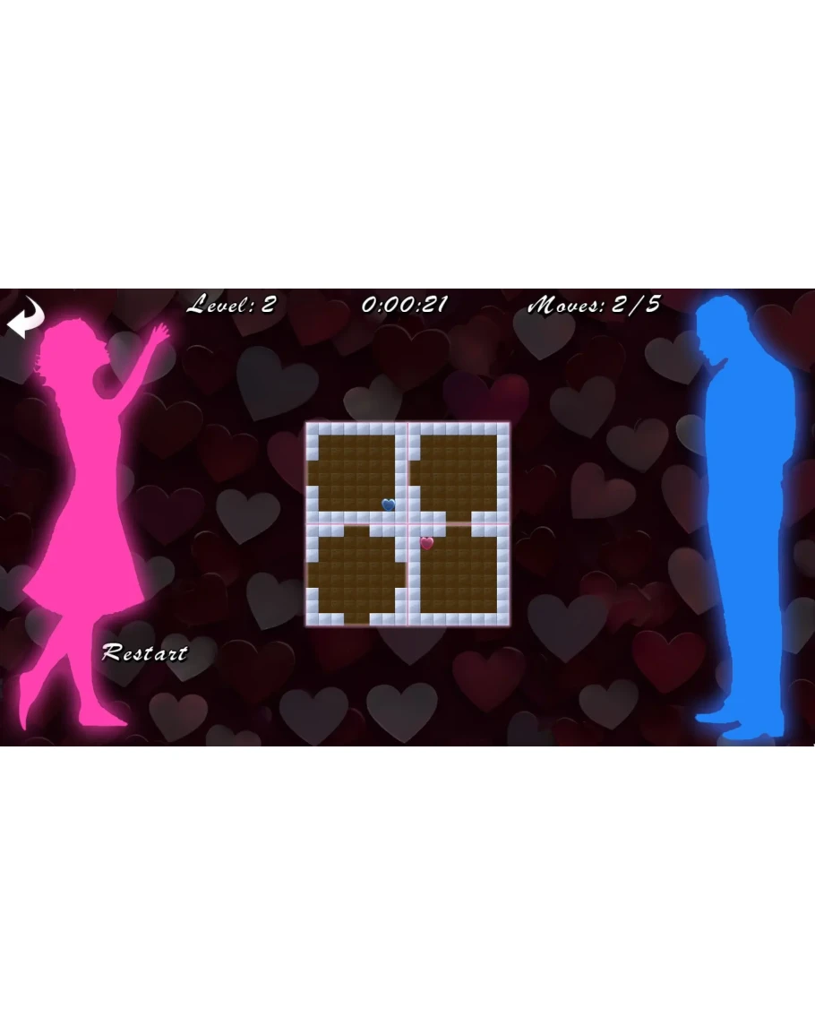 In this puzzle you need to swap the tiles to indirectly control the hearts that move towards each other until blocked by a wall.