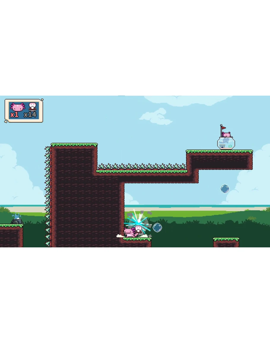 В Axobubble вы управляете дружелюбным аксолотлем в мире, полном платформ и творчества. Ваша основная способность — создавать плавающие пузыри, которые служат временными платформами. Используйте эти пузыри, чтобы прыгать выше, преодолевать опасные расстояния и собирать ракушки, продвигаясь к большой звездчатой ракушке в конце каждого уровня.