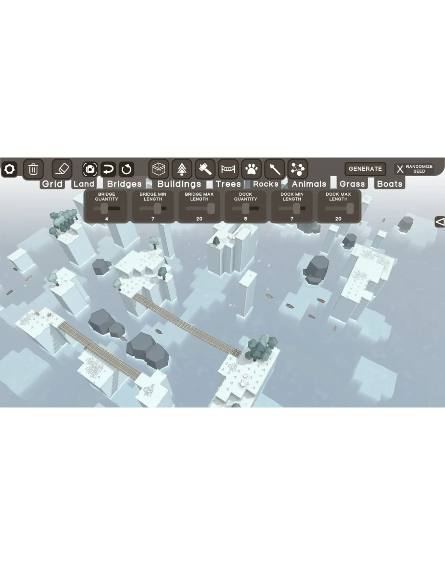 Постройте остров своей мечты - вручную или с использованием инструментов процедурной генерации. Создавайте уютные острова, выполняя задачи для разблокировки новых предметов и инструментов. Отрегулируйте количество мостов, максимальную высоту местности и тщательно настройте конфигурации, чтобы создать уникальные островные миры!