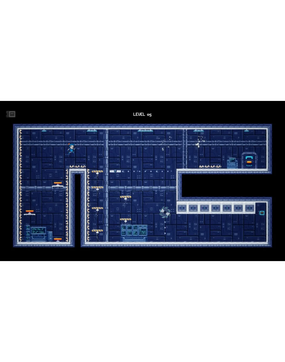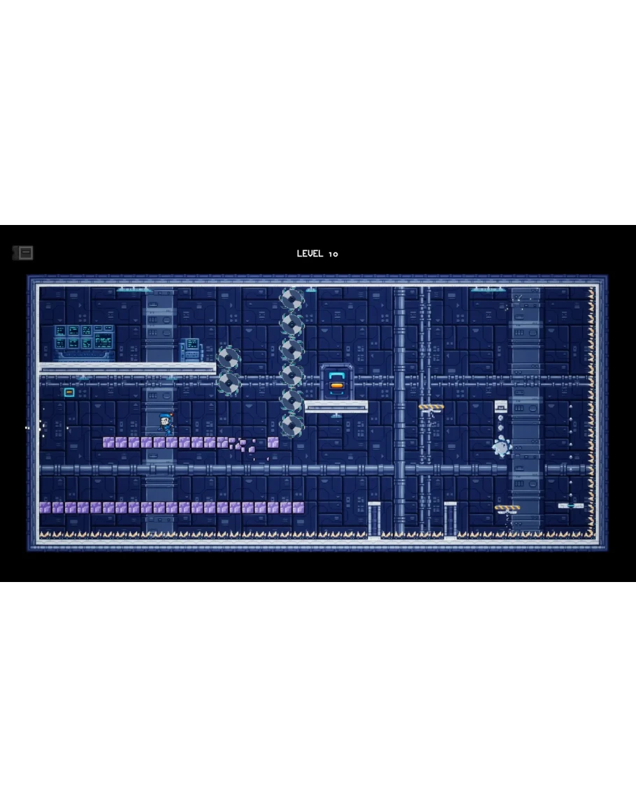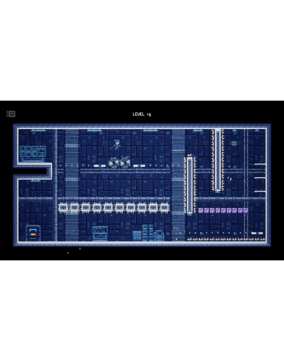 Каждый уровень — это один статичный экран, полностью видимый, заполненный шипами, пилами, лазерами и падающими платформами. Смерть мгновенна, возрождение тоже, что поддерживает высокий темп и напряжение.
