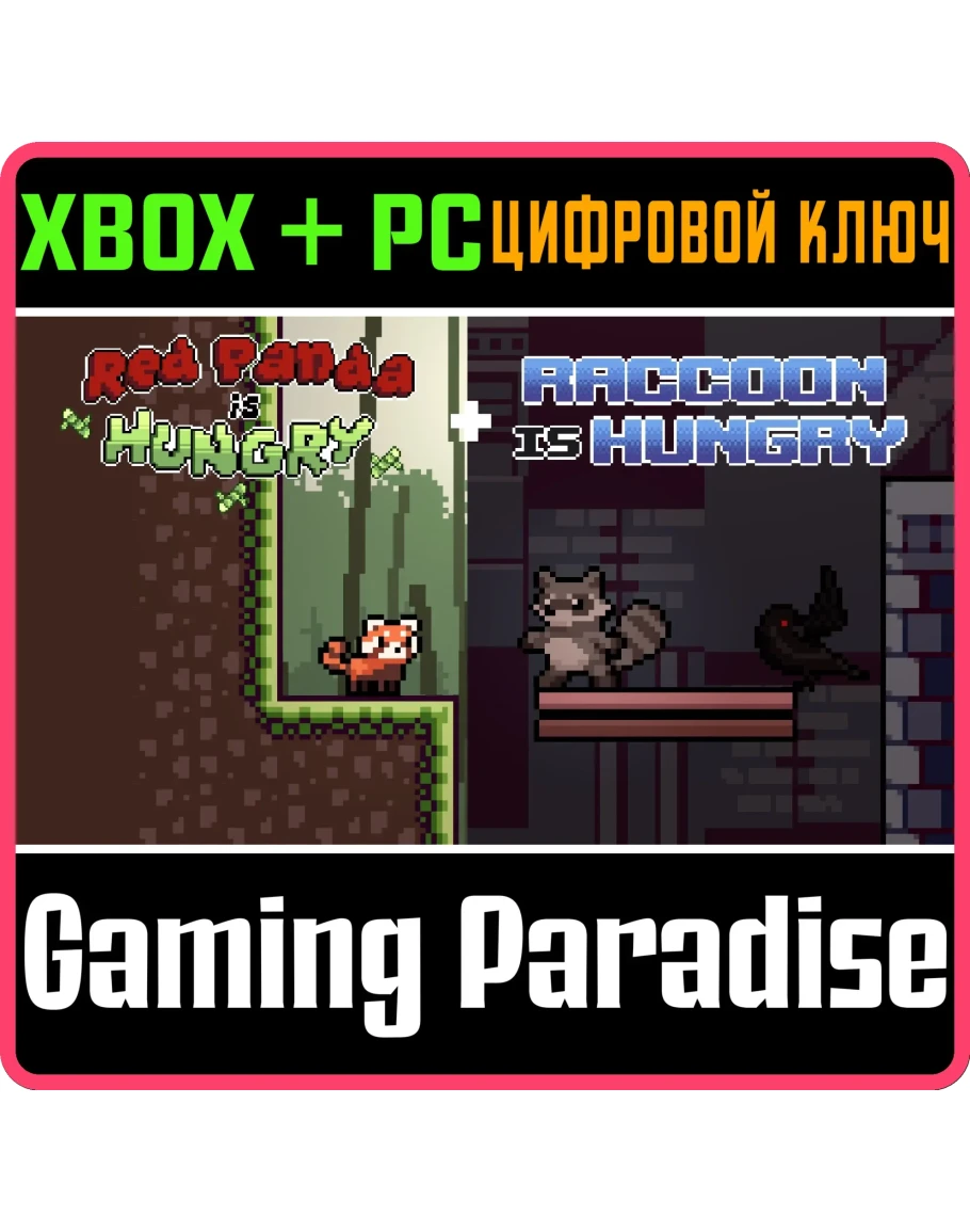В этот набор входят версии для Microsoft Store и Xbox первых двух игр серии "Is Hungry": Red Panda is Hungry и Raccoon is Hungry. Игра 1: Red Panda is Hungry Следуйте за обжорой красной пандой, которая готова на всё ради еды. Идите, прыгайте и скользите по бамбуковому лесу, полному ловушек и опасностей, чтобы достичь легендарного шведского стола. Red Panda is Hungry — это казуальный 2D платформер с милой пиксельной графикой. Управляйте красной пандой в поисках еды и собирайте все предметы на каждом уровне. После сбора всего — откроется новый уровень. Путешествуйте по лесу, собирайте весь бамбук и найдите тайное место, где еды больше, чем вы можете съесть. Игра 2: Raccoon is Hungry Raccoon is Hungry — вторая игра серии "Is Hungry". Отправьтесь в приключение вместе с обжорой енотом, который ищет еду в городе. Но здесь пища не валяется на улице. Чтобы поесть, енот должен рыться в мусорных баках в поисках яблок, пиццы, гамбургеров, винограда и других съедобных находок. Но будьте осторожны — не только еда прячется в мусоре! Какие сюрпризы ждут любопытного енота?