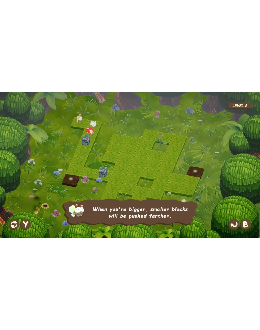 The character can have three distinct sizes (small, medium, and large), which affect interactions with crystal cubes. The character grows by collecting seeds and shrinks when taking damage—losing the game if hit while small. The game features various tile types and collectible items, such as mushrooms that increase the character’s size.