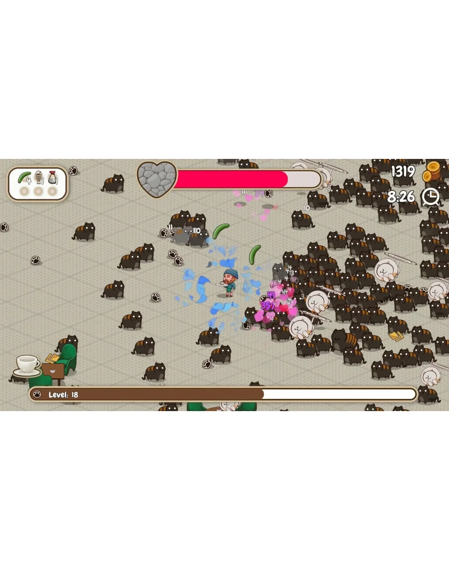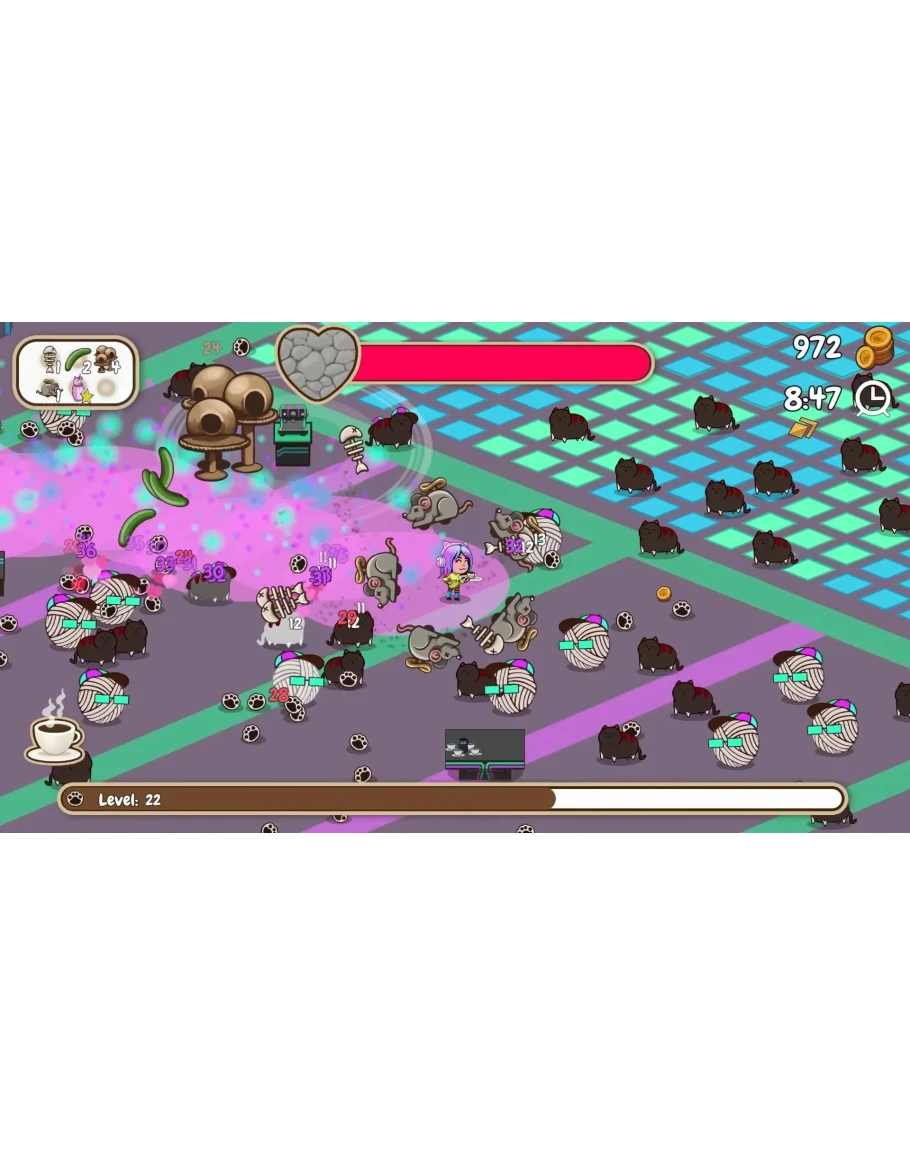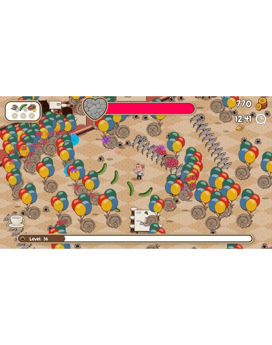 Кажется, это обычный день в кафе… но вдруг врываются толпы котов, жаждущих любви — и только ты можешь остановить их на пути к полному кошачьему хаосу! Вооружённый лазерными указками, клубками пряжи и даже ужасным огурцом судьбы, ты должен сдерживать пушистиков, пока подаёшь клиентам их драгоценный кофе. Пустяки, правда?