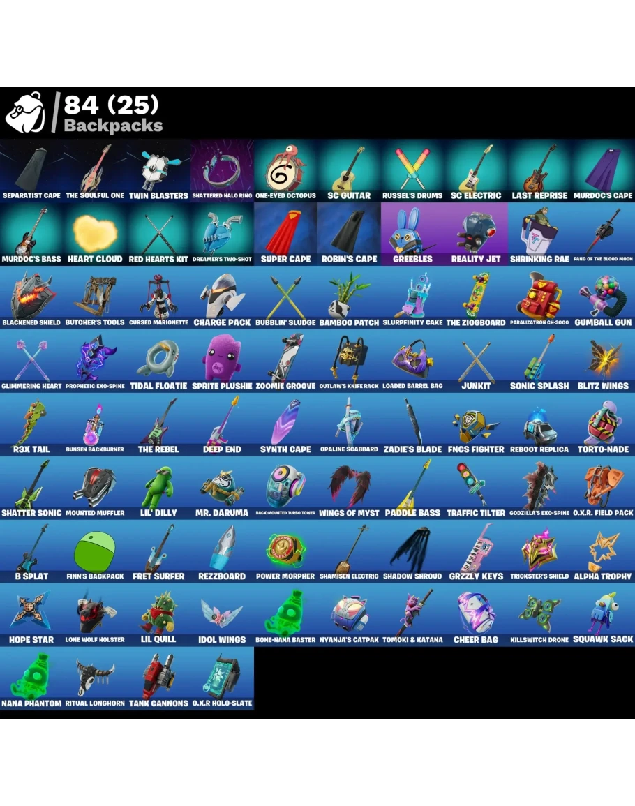 Аккаунт Fortnite с обширной коллекцией косметических предметов. Все предметы готовы к использованию — скины, кирки, дельтапланы, обёртки, рюкзаки, граффити, эмоции, баннеры и многое другое.