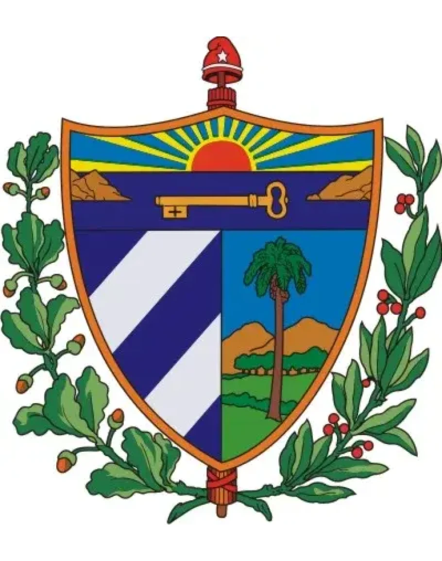 Герб Республики Куба обладает форму щита, разделенного на 3 доли, в верхней доли изображен ключ, расположенный м/у полуостровами Флорида и Юкатан, и запирающий вход в Мексиканский залив. Вдалеке видно восходящее солнце Свободы. Пальмы и вершины гор - знаки патриотизма, свободы и независимости Кубы. 3 синие полосы слева значат единство 3-х составных частей Кубы - синие полосы флага, Сверху герб венчает багряный фригийский колпак, символизирующий стремление к достижению высоких идеалов.