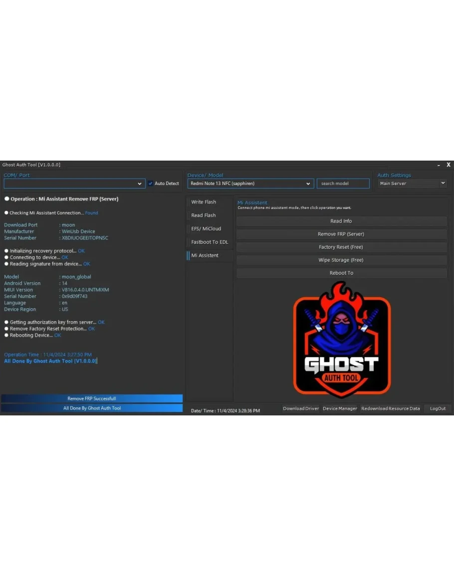 Ghost Auth Tool – это мощный и универсальный инструмент, специально разработанный для восстановления, прошивки и разблокировки устройств Xiaomi. Поддерживает работу с устройствами на процессорах Qualcomm и Mediatek, а также предлагает удобные решения для устранения сложных проблем.