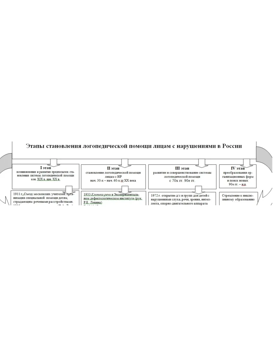 Сводная таблица по теме: "Этапы становления логопедической помощи лицам с нарушениями в России".