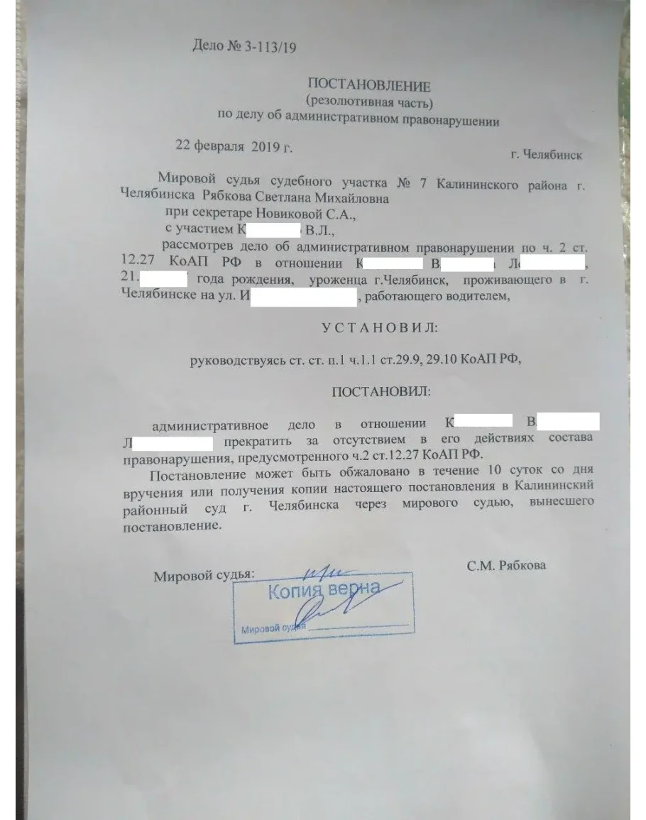 В архиве находятся возражения и резолютивная часть постановления о прекращении дела по части 2 статьи 12.27 КоАП РФ. По запросу отправлю мотивированное решение на электронную почту.