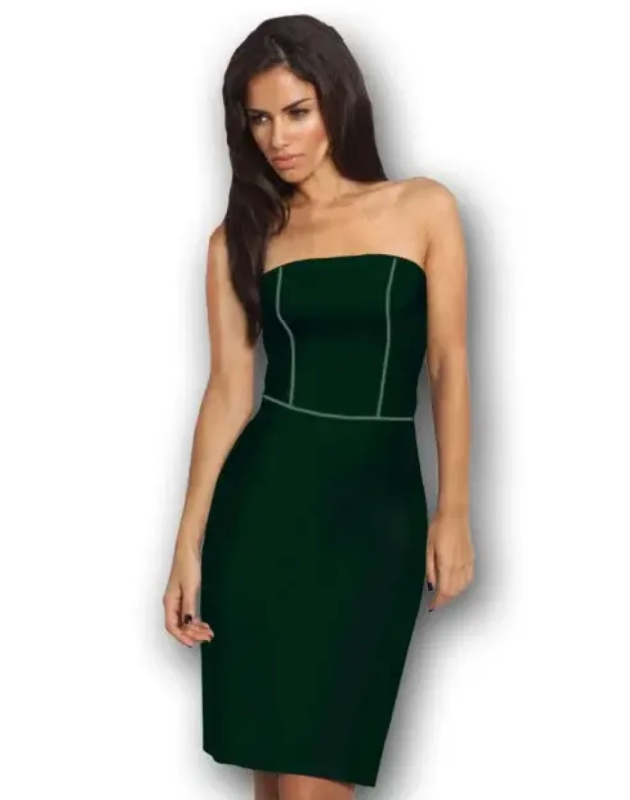 Выкройка платья с открытыми плечами прилегающего силуэта, отрезное по линии талии. Нижняя часть платья слегка зауженная книзу. На передней части лифа – два вертикальных рельефа. В верхней части среднего шва спинки расположена застежка-молния, в нижней части - разрез.
