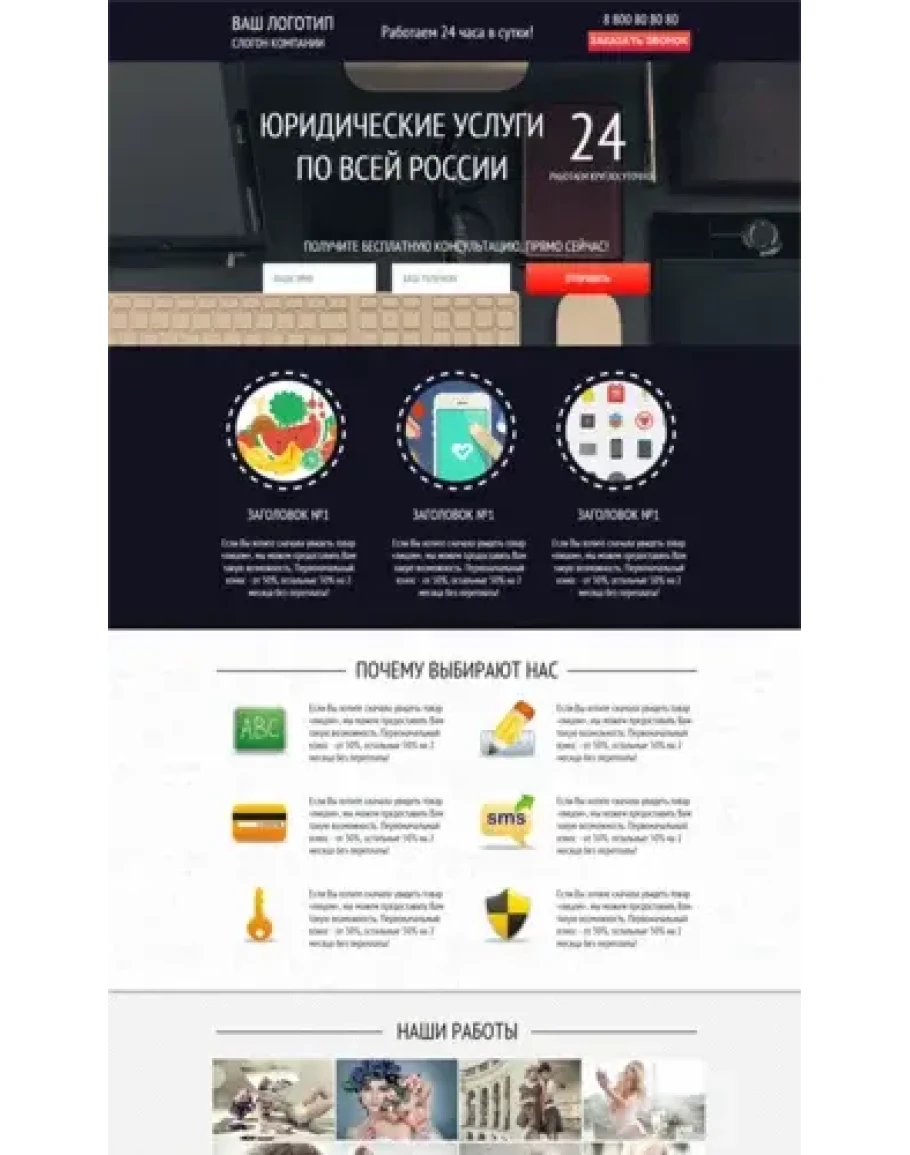 Лендинг пейдж состоящий из 7 визуальных блоков.