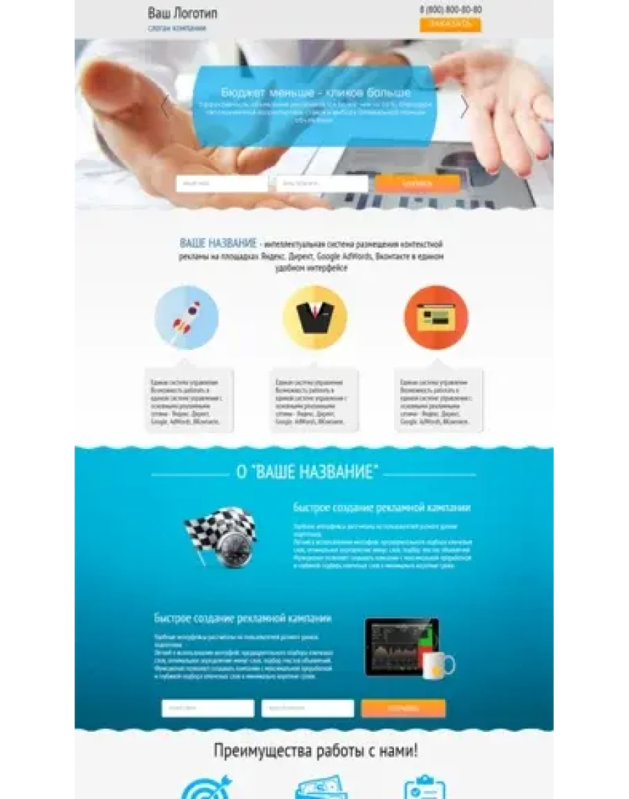 Лендинг пейдж состоящий из 5 визуальных блоков.