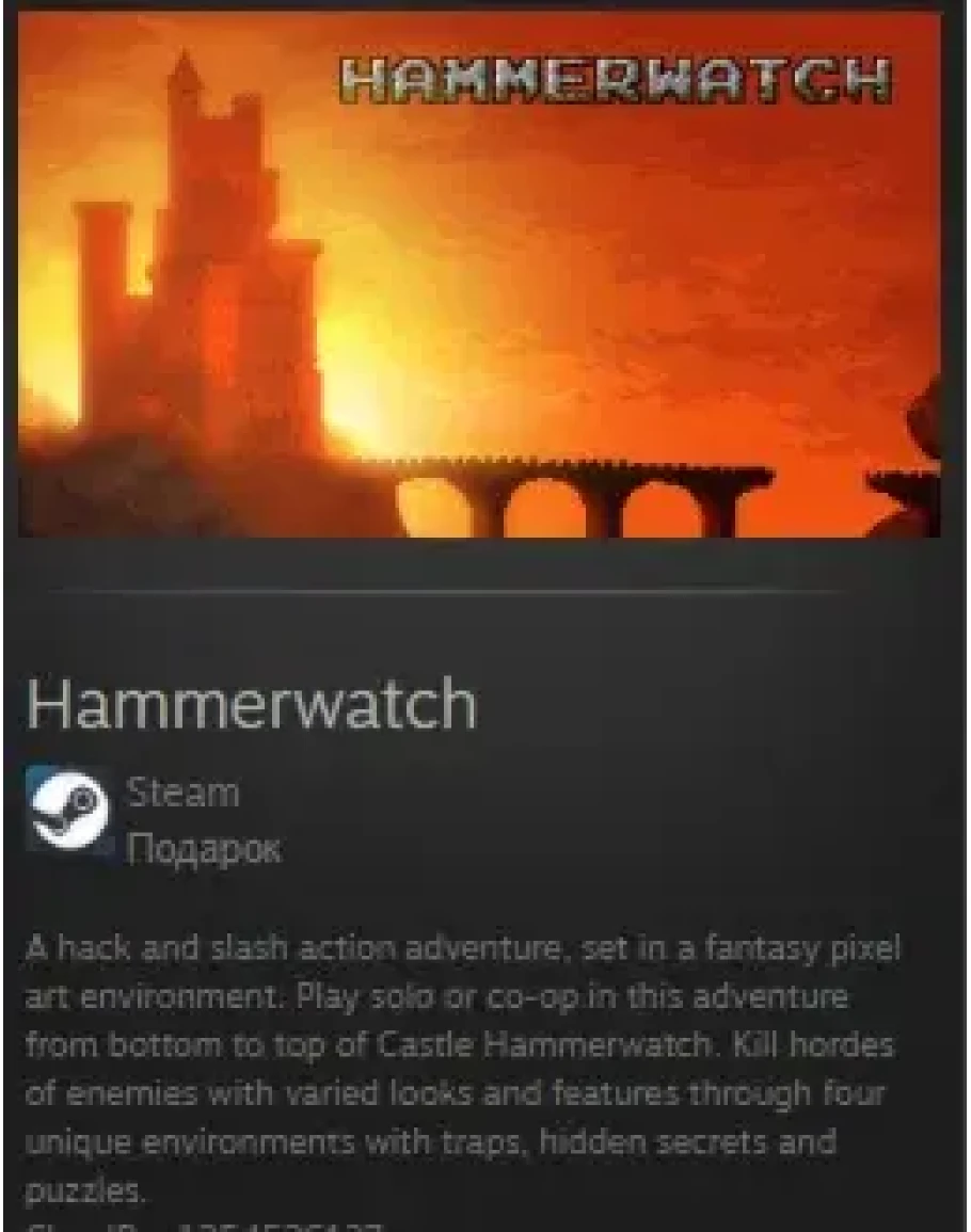 Приключенческий боевик, действие которого происходит в фэнтезийной пиксельной среде. Играйте в одиночку или вместе в этом приключении снизу доверху в Замке Хаммервотч. Убивайте полчища врагов с разнообразным внешним видом и особенностями в четырех уникальных средах с ловушками, скрытыми секретами и головоломками.