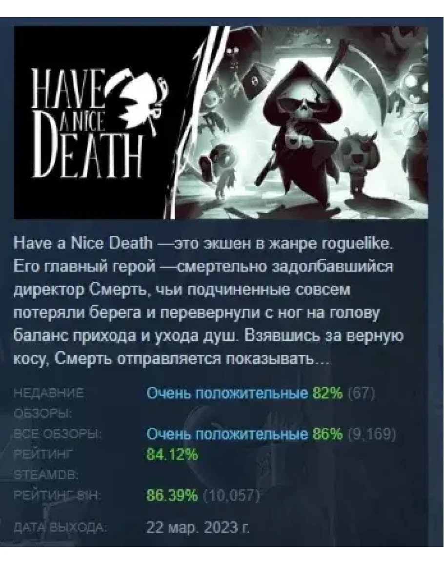 Have a Nice Death —это экшен в жанре roguelike. Его главный герой —смертельно задолбавшийся директор Смерть, чьи подчиненные совсем потеряли берега и перевернули с ног на голову баланс прихода и ухода душ. Взявшись за верную косу, Смерть отправляется показывать сотрудникам, кто тут все-таки главный.