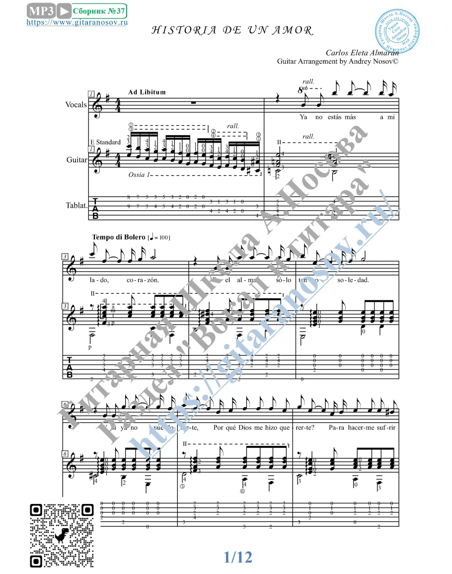 Кликните "Подробнее" для получения дополнительной информацииВашему вниманию предлагается композиция "Historia De Un Amor (C.Almaran)", предназначенная для вокала в сопровождении 6-ти струнной гитары. Запись выполнена нотами и включает в себя партию вокала с подтекстовкой, партию гитары с подробнейшей аппликатурой и текст песни (НА ИСПАНСКОМ). Партия гитары продублирована табулатурой.