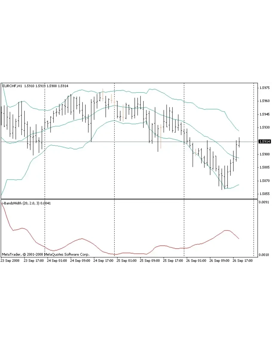 Индикатор написан по книге Д.Боллинджер: "Боллинджер о лентах Боллинджера". Показывает разность между верхней и нижней линиями Боллинджера.