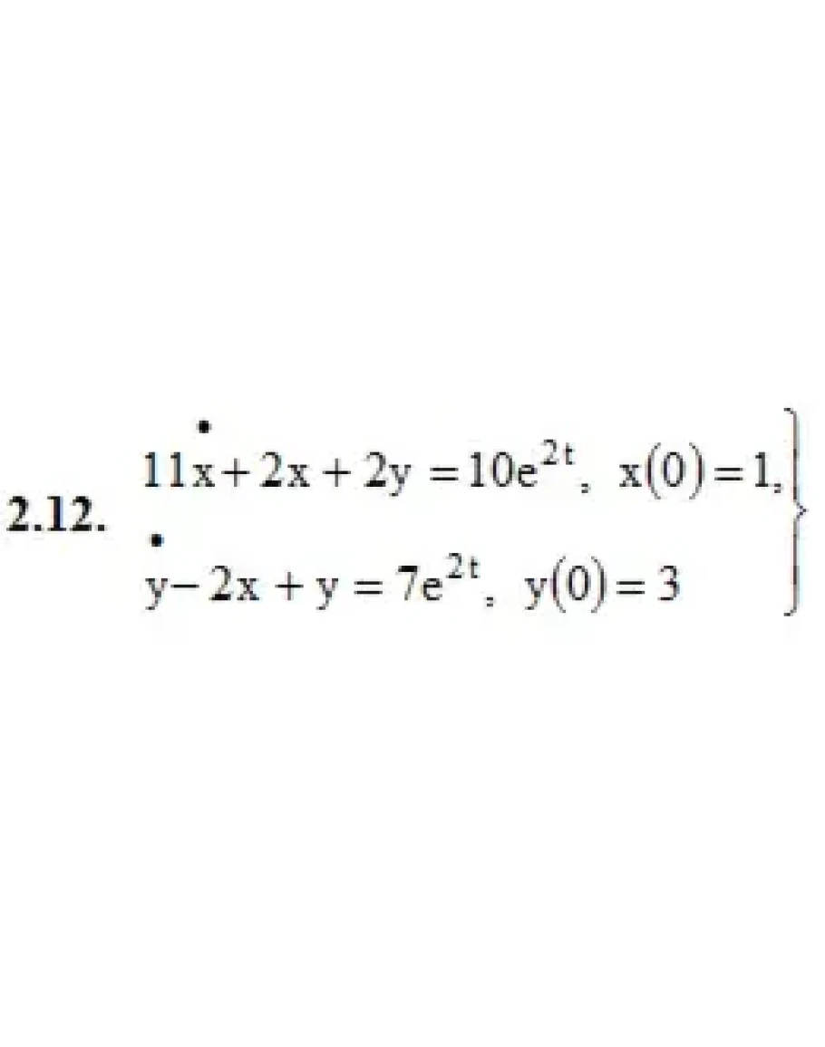 2.12. a1 = 11, b1 = 0, c1 = 2, d1 = 2, f1(t) = 10e2t, a2 = 0, b2 = 1, c2 = −2, d2 = 1, f2(t) = 7e2t, x(0) = 1, y(0) = 3