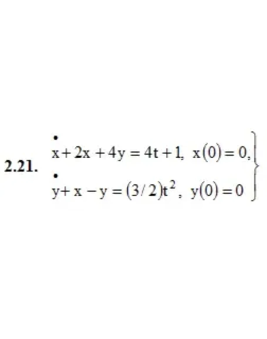 2.21. a1 = 1, b1 = 0, c1 = 2, d1 = 4, f1(t) = 4t+1, a2 = 0, b2 = 1, c2 = 1, d2 = −1, f2(t) = (3/2)t2, x(0) = 0, y(0) = 0