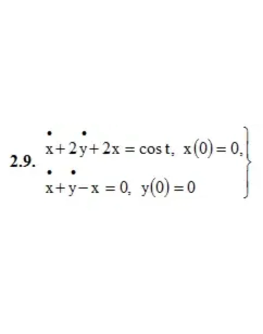 2.9. a1 = 1, b1 = 2, c1 = 2, d1 = 0, f1(t) = cost, a2 = 1, b2 = 1, c2 = −1, d2 = 0, f2(t) = 0, x(0) = 0, y(0)=0