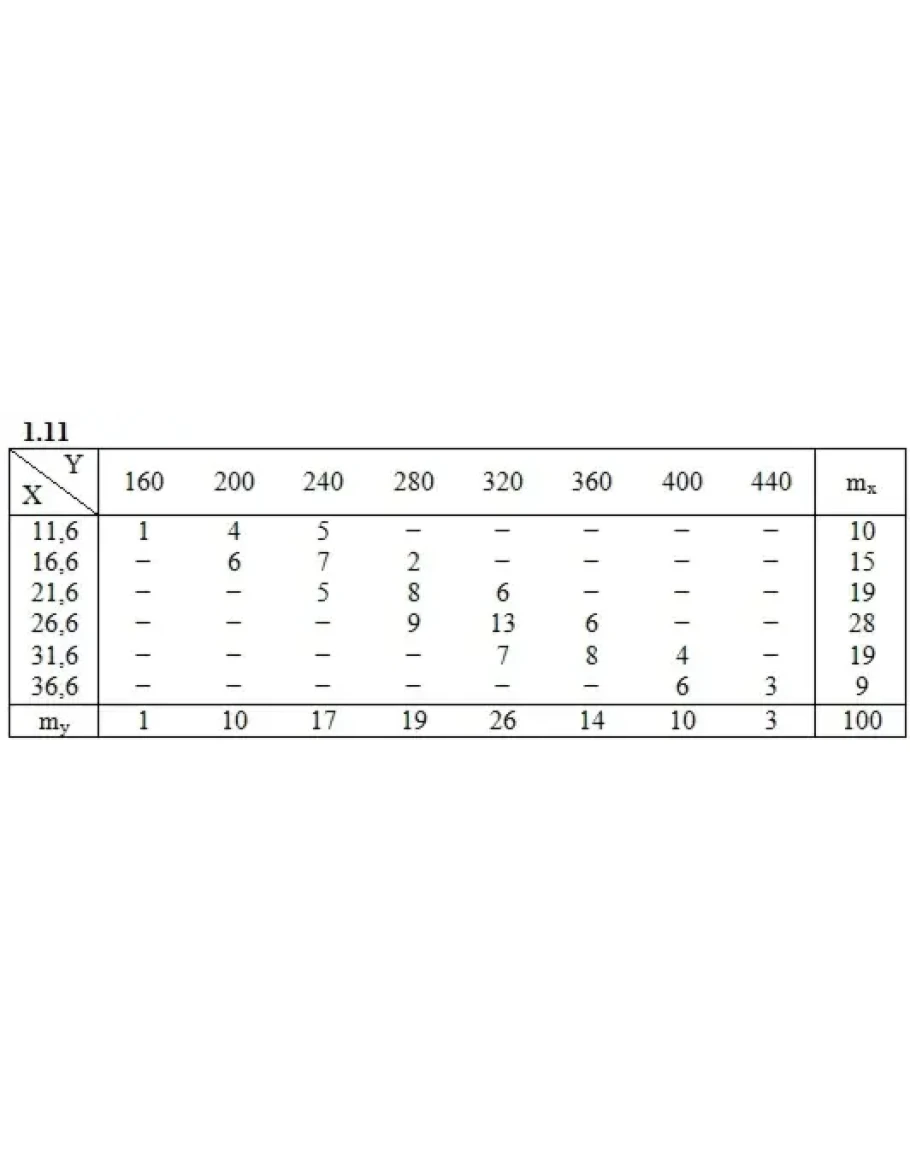 Дана таблица распределения 100 заводов по производственным средствам X(тыс. ден. ед.) и по суточной выработке Y(т). Известно, что между X и Y существует линейная корреляционная зависимость. Требуется: