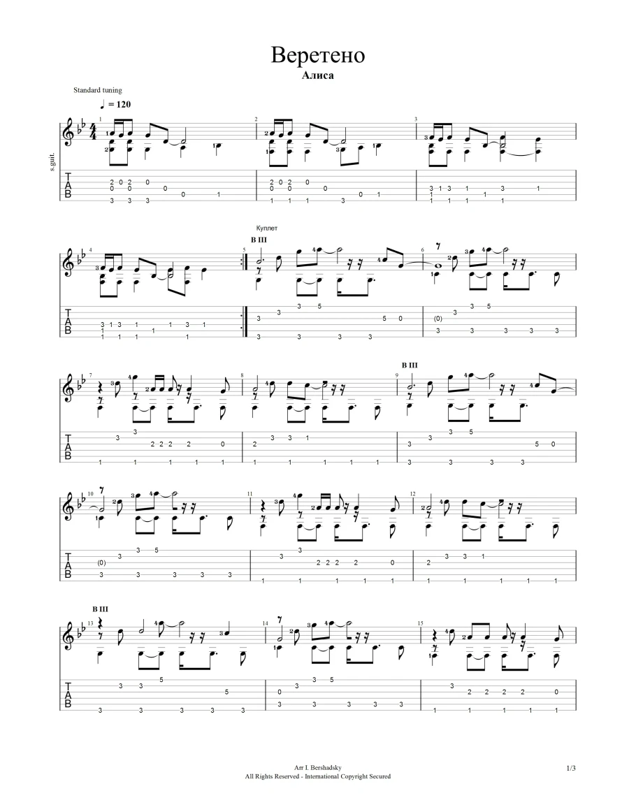 Ноты для акустической гитары группы Алиса "Веретено". Подробная аппликатура левой руки.