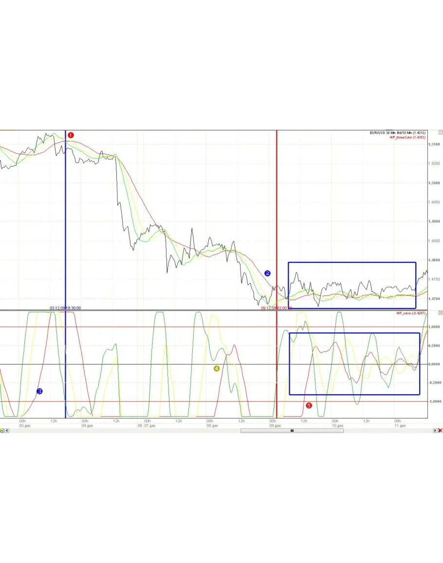 Индикатор срабатывает, как правило, после пересечения красной линией уровня (1,-1) сверху вниз – тренд направлен вниз, снизу вверх – тренд идет вверх. Две другие линии сигнализируют о приближении момента смены тренда (смотри кружочки с цифрами 3,4,5). Но последовательность может быть иной. Для большей вероятности необходимо дождаться пересечения двумя линиями хотя бы нулевой отметки и третьей отметки (1,-1). Индикатор автономен и не зависит от результатов других индикаторов. На картинке показано совместное использование с WP_threeColor_Rek (Триколор).