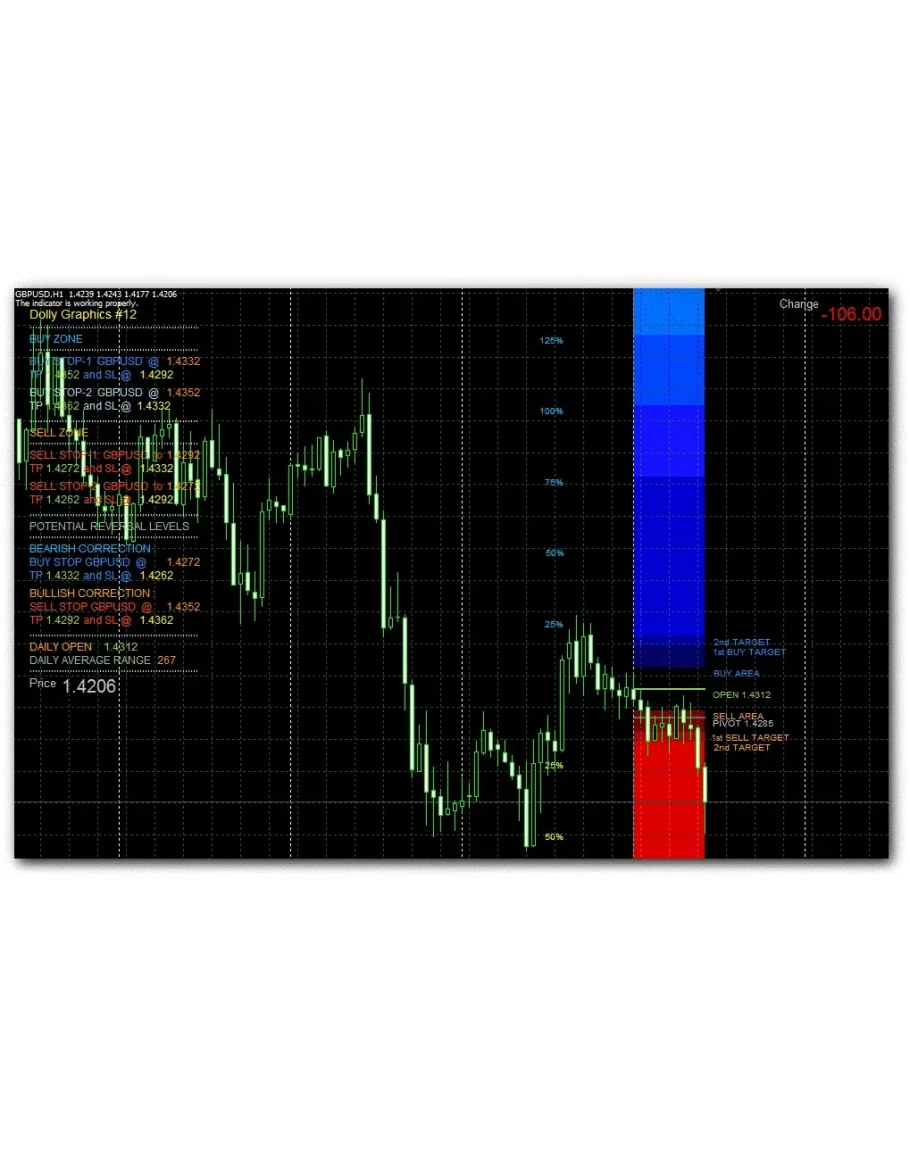 Индикатор Dolly Graphics v12 выдает множество информации о состоянии рынка, а также рекомендации на покупку или продажу. Графически отображаются зона "Быков" и зона "Межведей".