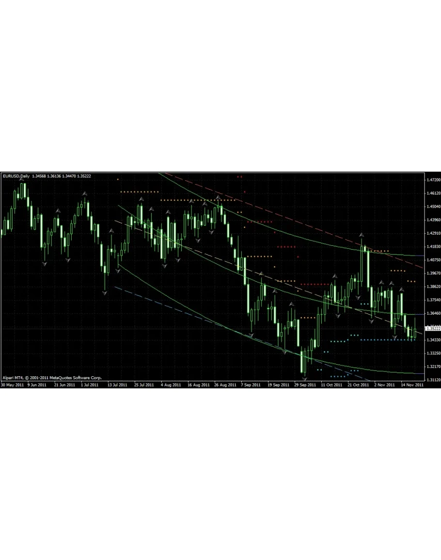 Используя значение среднеквадратичной девиации и соответствующие коэффициенты Фибоначчи, индикатор по специальному алгоритму вычисляет значения адаптивных уровней "стоп" и "стоп/разворот" для текущей цены. Данные уровни можно трактовать как мгновенные предельные значения девиации на временном участке последнего бара. Эти значения показываются разноцветными точками выше и/или ниже цены в соответствии с состоянием валютной пары. Точки синих оттенков отрисовываются ниже цены, более светлые из них - это "стоп", более тёмные - "стоп/разворот". Точки красных оттенков отрисовываются выше цены, и также показывают уровни стопов и разворотов. Для любого значения цены на любом баре индикатор всегда отображает только два уровня мгновенных значений, а не все четыре. Это помогает сделать соответствующие выводы о состоянии тренда. Важная деталь - при истинном пробитии одного или сразу двух уровней стопов, когда цена закрытия бара выходит за соответствующий уровень, индикатор это событие отображает реверсом мгновенных значений - скажем, если до пробития это были уровни сопротивления, то после пробития индикатор отрисовывает вместо них мгновенные уровни поддержки. Таким образом, если вы видите реверс - это как минимум краткосрочная смена тренда на мелкую коррекцию.