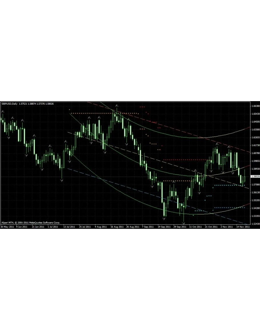 По заданному коэффициенту регрессии рассчитывается и отображается соответствующий нелинейный канал, который необходим для прогнозирования ближайшего будущего, и помимо этого выполняющий ту же роль, что и линейный канал, то есть отображение действительных уровней поддержки и сопротивления, но динамически и нелинейно изменяющихся во времени. По умолчанию используется коэффициент параболической регрессии, то есть 2.