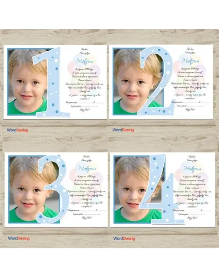 Готовые шаблоны 1-4 года приглашения на детский День Рождения для мальчика в формате Microsoft Word, с текстом на русском языке.