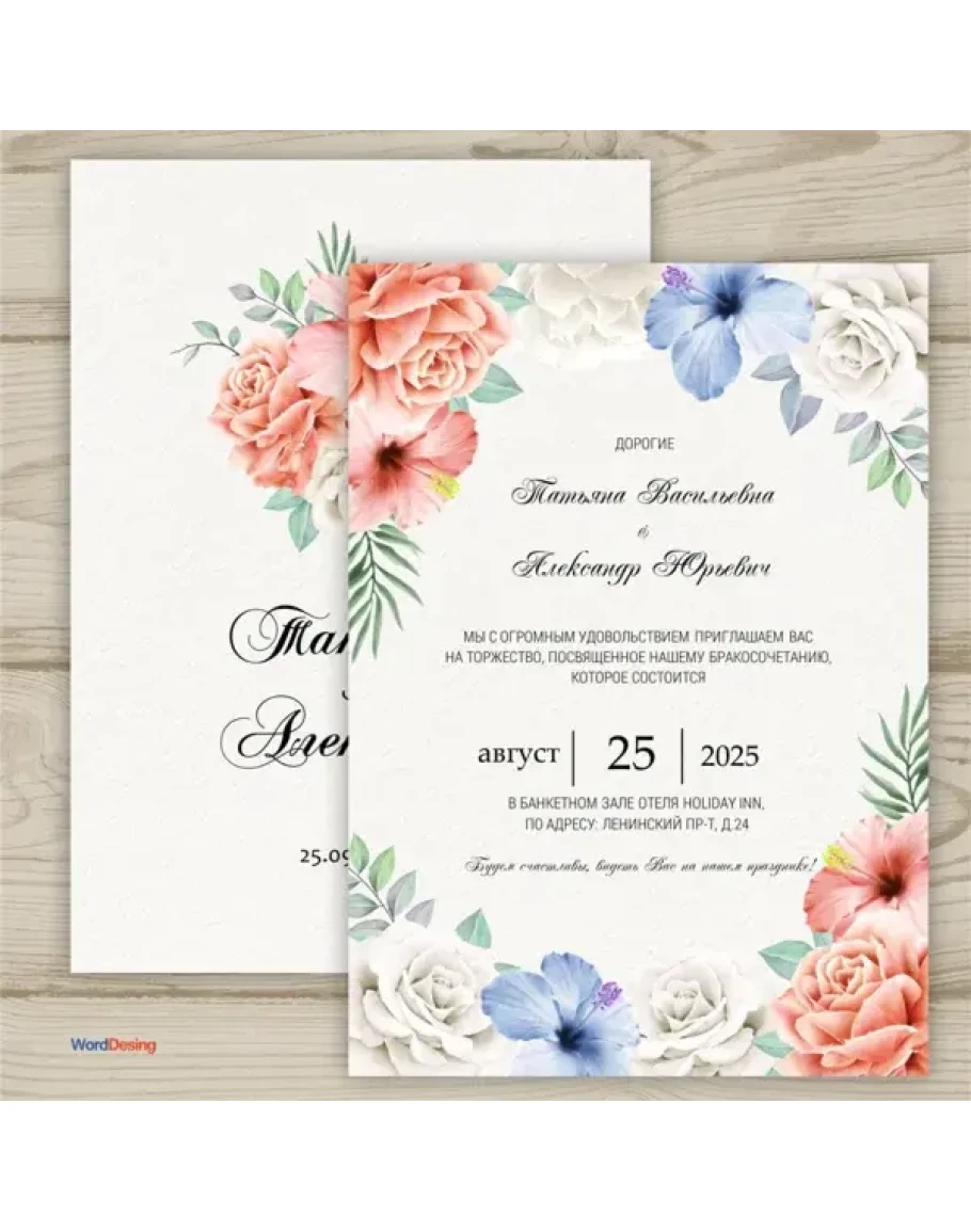 Красивый шаблон приглашения на свадьбу в формате Microsoft Word.Шаблон был сделан в программе Фотошоп и для удобства был переведен в Microsoft Word
