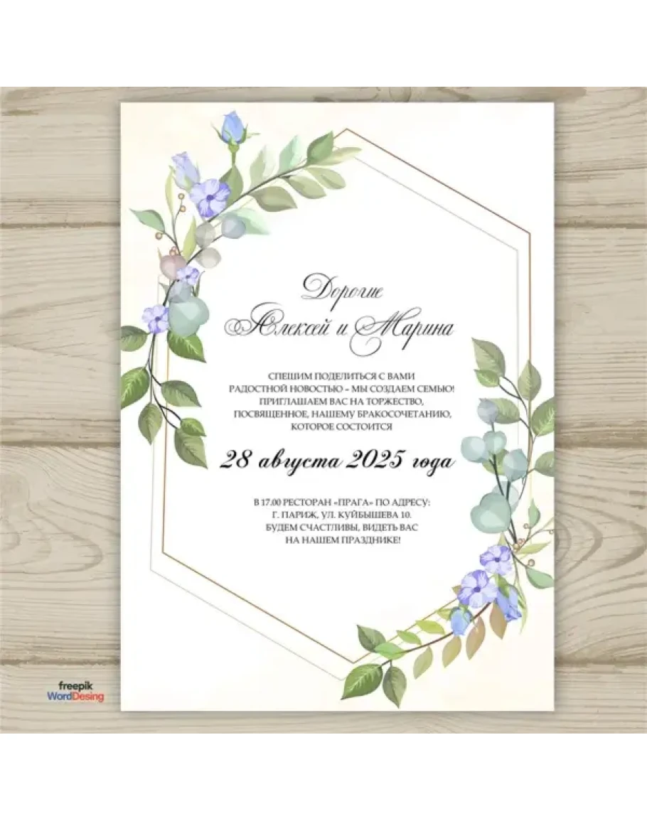 Приглашения на свадьбу сделано в профессиональных дизайнерских программах и для удобства и легкости редактирования текста было переведено в формат Microsoft Word, что дает Вам с легкостью поменять/добавить текст, размер шрифта, цвет текста.