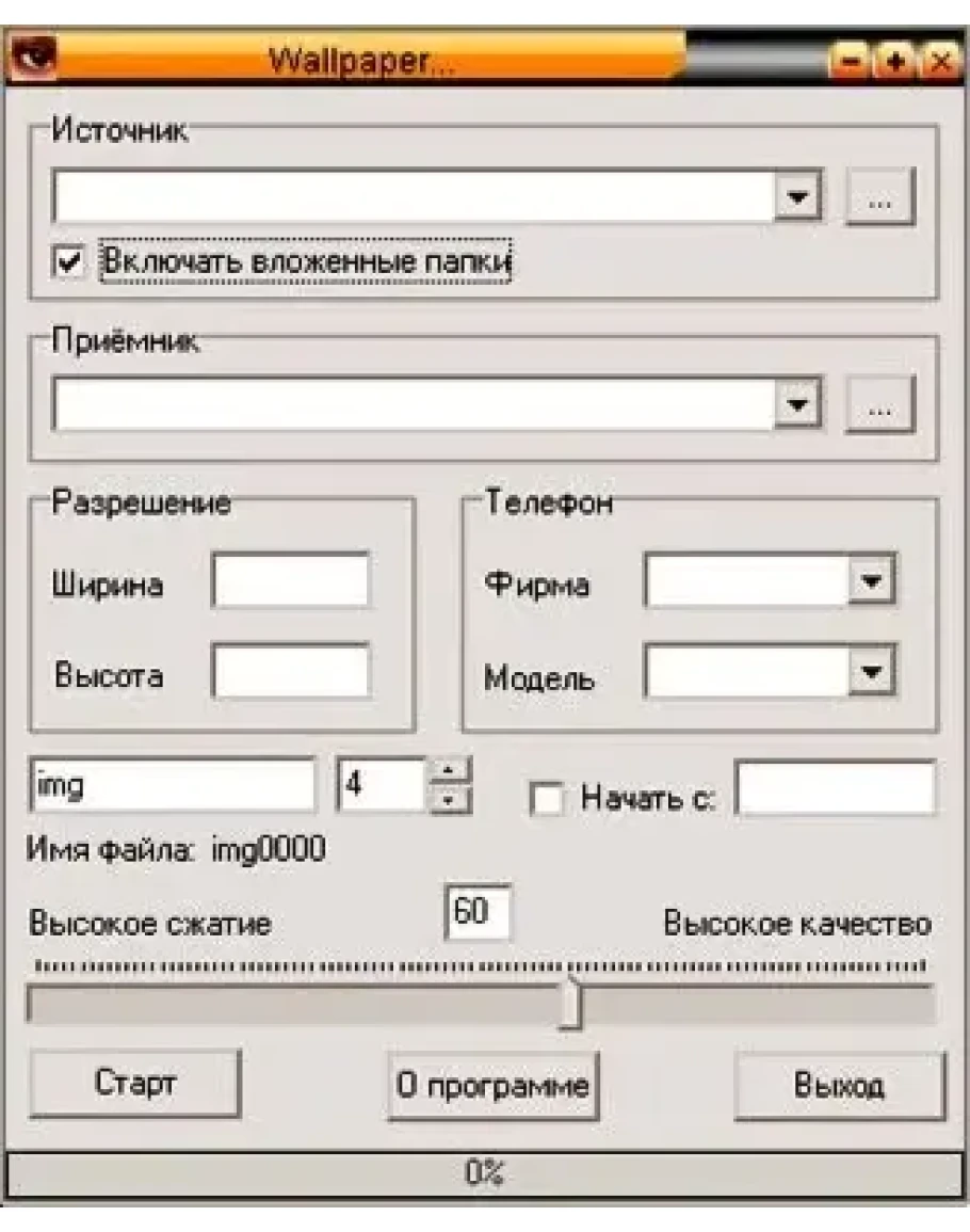 Программа для изменения размеров изображения под конкретный мобильный телефон. Чтобы не сидеть в фотошопе и не подгонять каждую картинку под ваш дисплей используйте эту программу и она сама всё сделает за вас. Вам надо только указать каталог с файлами jpeg или bmp. Выбрать директорию куда сохранить созданные файлы. Файлы сохраняются в формате ++.jpg Например: img0001 или animal000001. Если файлов много то сохранение будет следующее: img0001, img0002 .... img0010 и т.д. Затем указываите ширину и высоту дисплея телефона и задаёте качество сжатия.