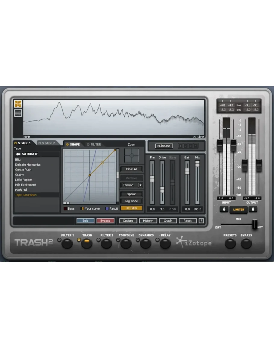 Trash обладает чрезвычайно реалистичным моделированием усилителя, устройства, кабинета, эффекта и динамика, что позволяет вам полностью поместить звук в другое пространство (или объект). Выбирайте из классики, комбо, бутик-моделей и стеков или играйте с творческими синтетическими импульсами из разных источников. Для любой ситуации найдется тон и характер — пусть Trash выведет вас за рамки стандартных телефонов, радиочасов, листового металла, плексигласовых трубок, корпусов пианино, жестяных банок и многого другого.