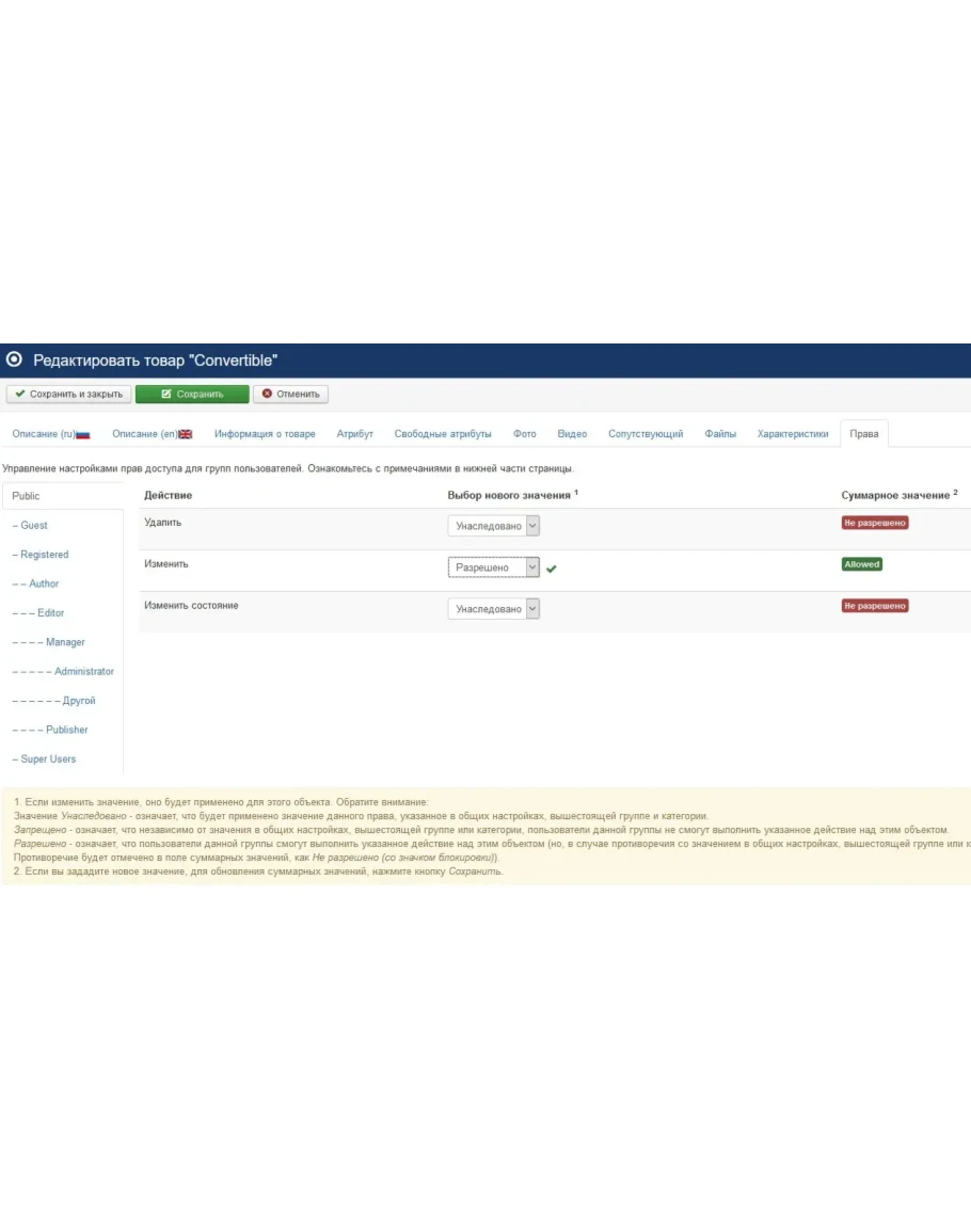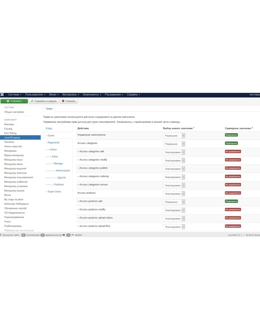 Позволяет настраивать права доступа к элементам Joomshopping. Например: для курьеров сделать доступным только просмотр вкладки "Заказы", для контент-менеджеров - только редактирование товаров и категорий и т.д.