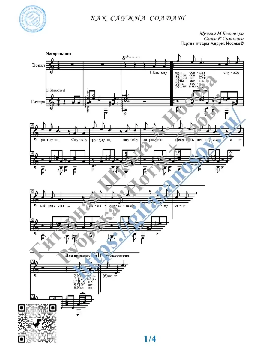 Кликните "Подробнее" для получения дополнительной информацииВашему вниманию предлагается композиция "Как служил солдат (муз.М.Блантера, сл.К.Симонова)", предназначенная для вокала в сопровождении 6-ти струнной гитары. Запись выполнена нотами и включает в себя партию вокала с подтекстовкой, партию гитары с подробнейшей аппликатурой и текст песни (НА РУССКОМ).