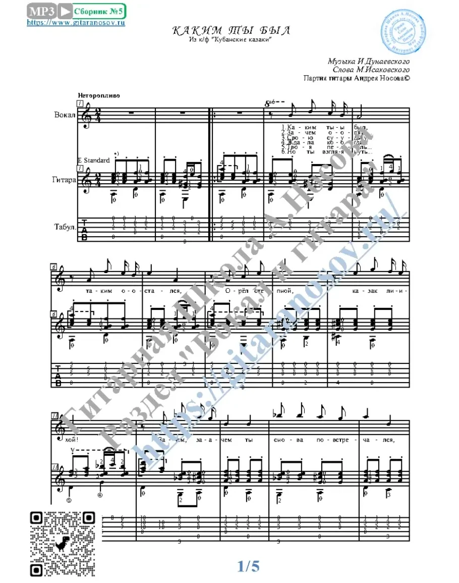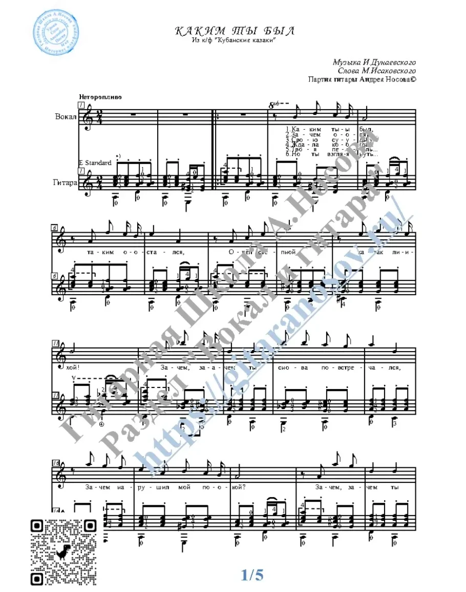 Кликните "Подробнее" для получения дополнительной информацииВашему вниманию предлагается композиция "Каким ты был (муз.И.Дунаевского, сл.М.Исаковского)", предназначенная для вокала в сопровождении 6-ти струнной гитары. Запись выполнена нотами и включает в себя партию вокала с подтекстовкой, партию гитары с подробнейшей аппликатурой и текст песни (НА РУССКОМ).