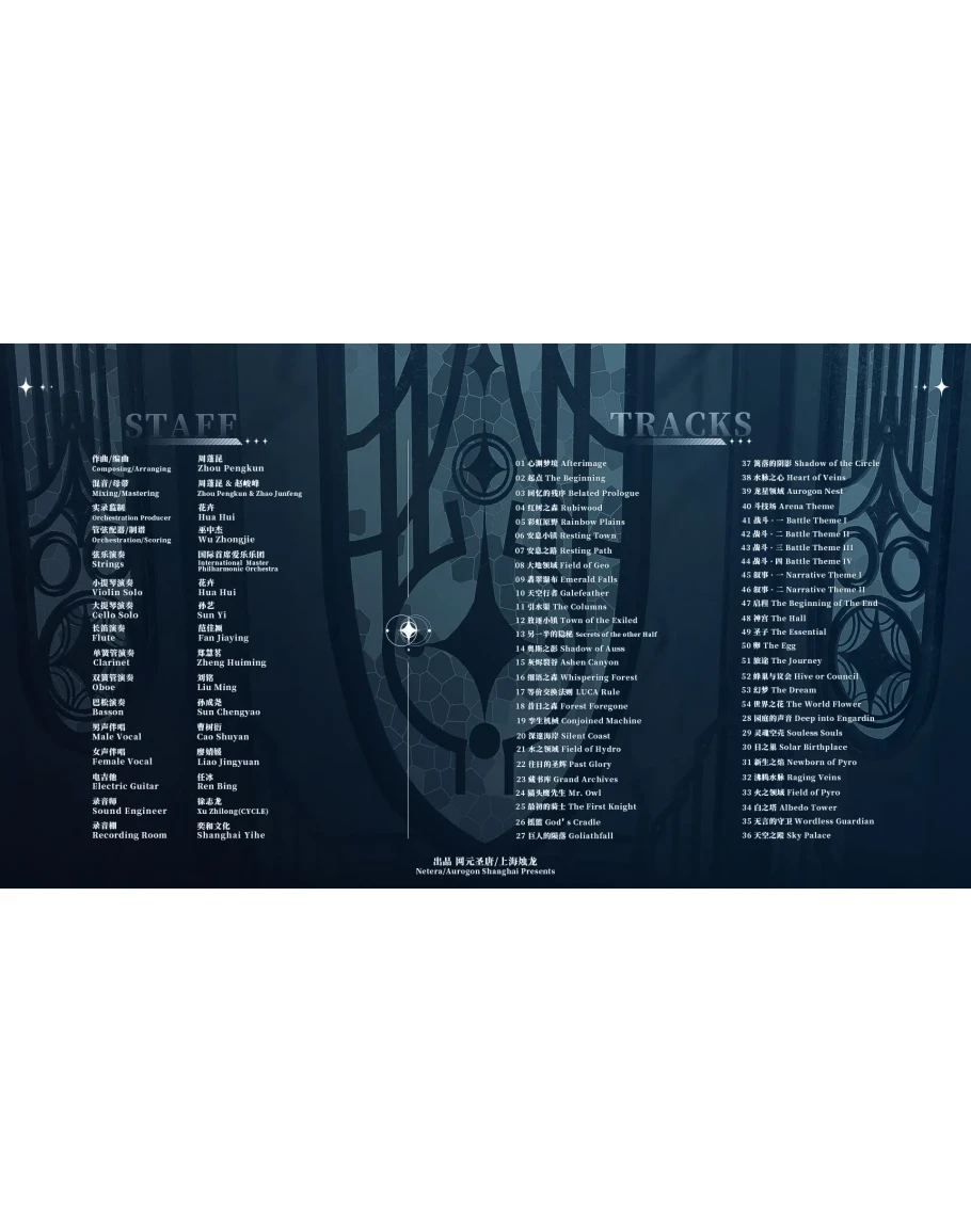 Explore the vast and magnificent world of Engardin with original soundtracks of various themes! The collection of Afterimage Original Soundtracks includes 54 tracks, brought by Aurogon Shanghai, International Master Philharmonic Orchestra and various artists.