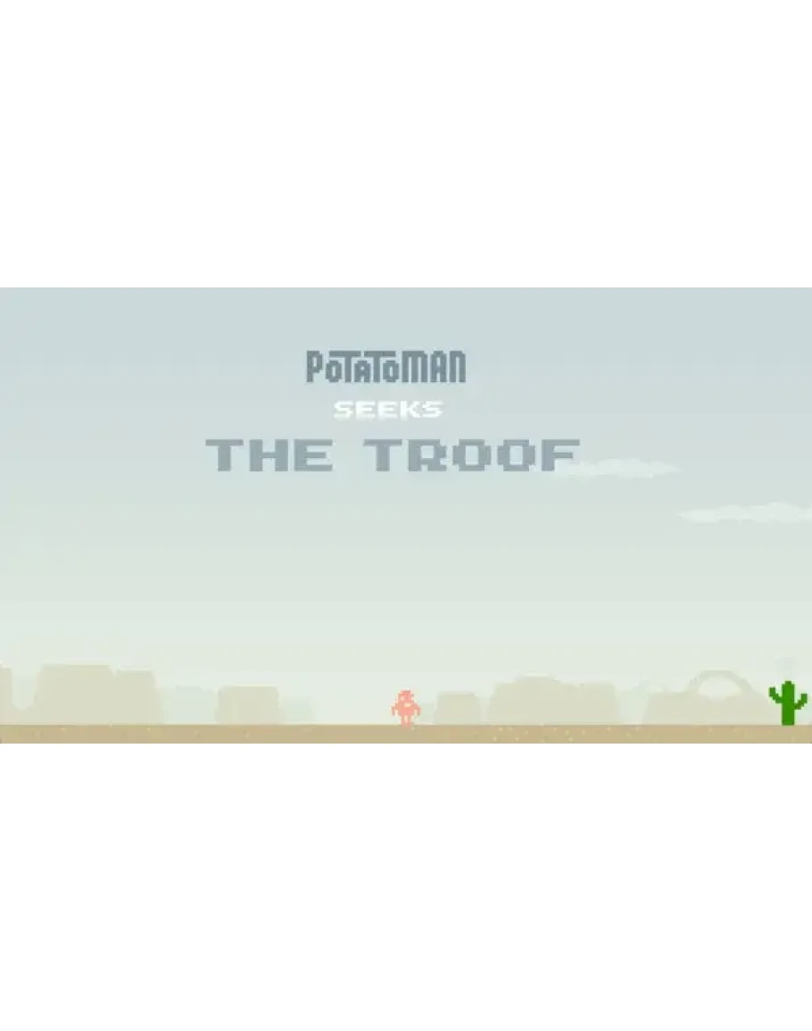 Potatoman will put your reflexes and worldview to the test as you journey through scorching deserts, dark forests, busy cities, the tallest mountains and eventually your own potato-consciousness in search of the ultimate answer. Are you prepared to face the TROOF?