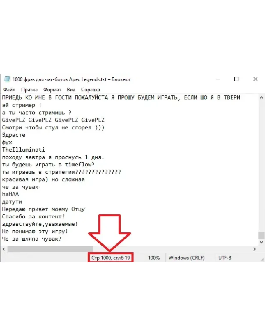 Текстовый файл с фразами (1000 фраз на русском без дословных повторений) для чат-ботов имитирующих общение на стриме либо в заданном чате с помощью сервисов и программ в коaторые загружается данный файл с фразами (товар не содержит софт, а только текстовый файл с фразами которые не повторяются, не имеют привязки к месту, конкретному каналу, стримеру). Файл не содержит дословных повторов фраз!