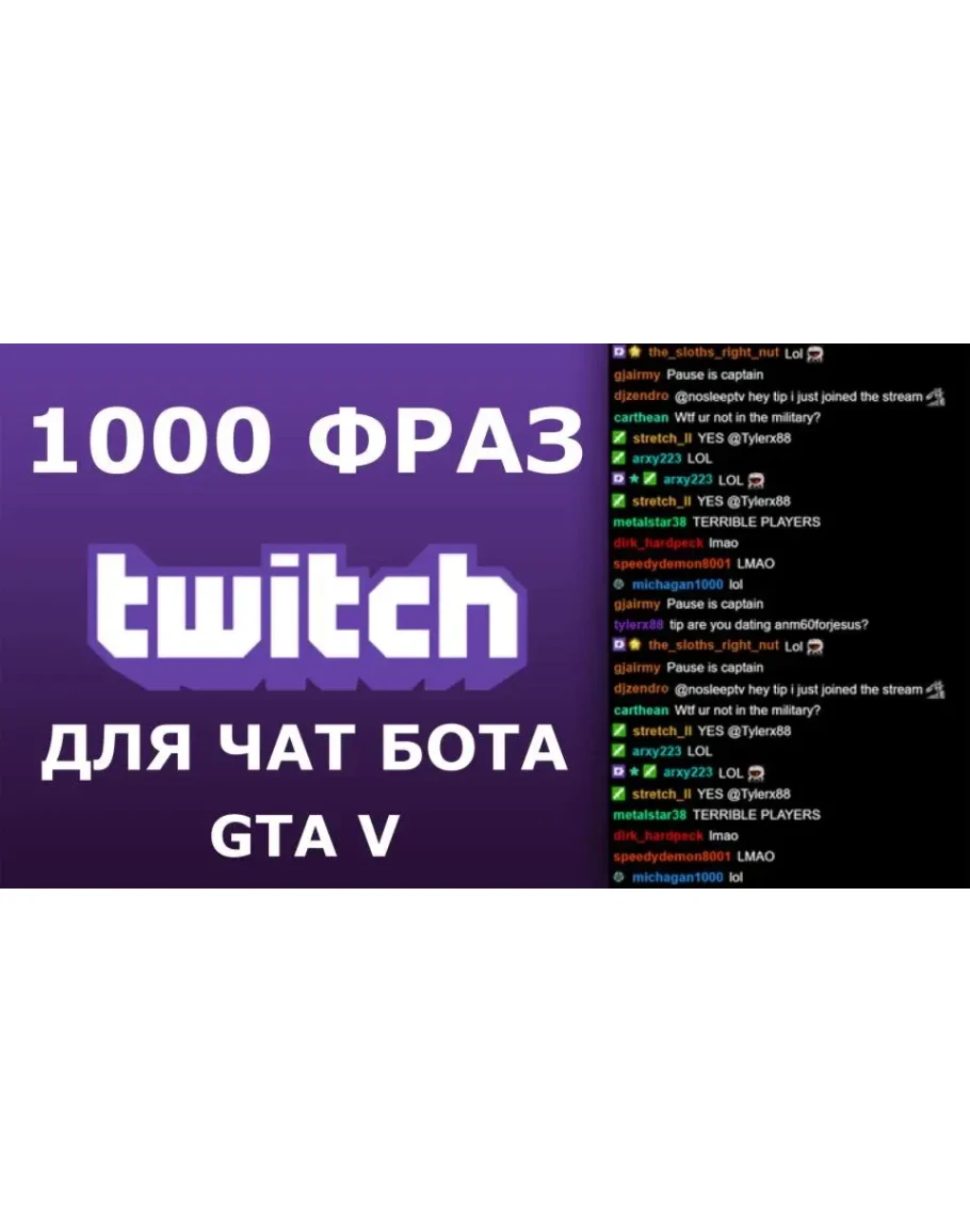 Текстовый файл с фразами (1100 фраз на русском GTA V) для чат-ботов имитирующих общение на стриме либо в заданном чате с помощью сервисов и программ в которые загружается данный файл с фразами (товар не содержит софт, а только текстовый файл с фразами которые не повторяются, не имеют привязки к месту, конкретному каналу, стримеру) Файл не содержит дословных повторов фраз!