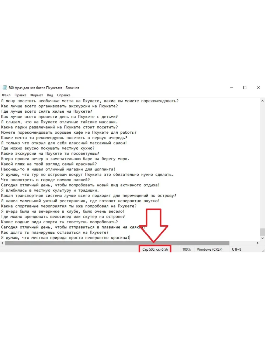 Текстовый файл с фразами (500 фраз на русском обсуждение отдыха на острове Пхукет) для чат-ботов имитирующих общение на стриме либо в заданном чате стриминговой площадки или телеграмм канале с помощью сервисов и программ в которые загружается данный файл с фразами обсуждение отдыха на острове Пхукет (товар не содержит софт, а только текстовый файл с фразами которые не повторяются) Файл не содержит дословных повторов фраз!