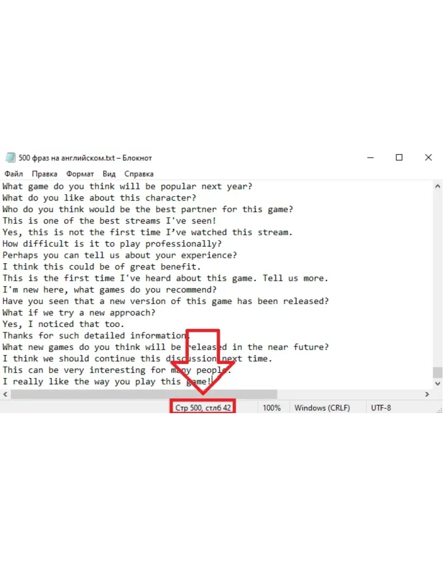 Текстовый файл с фразами (500 ФРАЗ НА АНГЛИЙСКОМ ЯЗЫКЕ) для чат-ботов имитирующих общение на стриме либо в заданном чате с помощью сервисов и программ в которые загружается данный файл с фразами (товар не содержит софт, а только текстовый файл с фразами которые не повторяются, не имеют привязки к месту, игре, конкретному каналу, стримеру) Файл не содержит дословных повторов фраз!